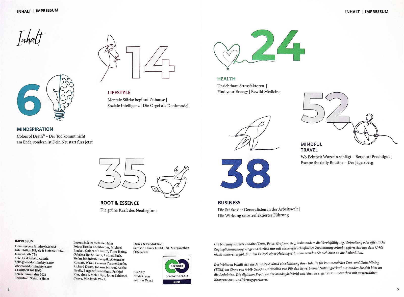 Inhalte: Lifestyle mit Substanz, ganzheitliche Gesundheit, Business-Strategien mit Sinn, Money Mindset für finanzielle Klarheit, Mindful Travel für bewusstes Reise sowie inspirierende Portraits, Interviews und Specials, die echte Veränderung ins Leben bringen. Das Magazin liefert Hintergründe, Methoden, Übungen und Best Practices – hochwertig und nachhaltig produziert, spürbar, inspirierend.