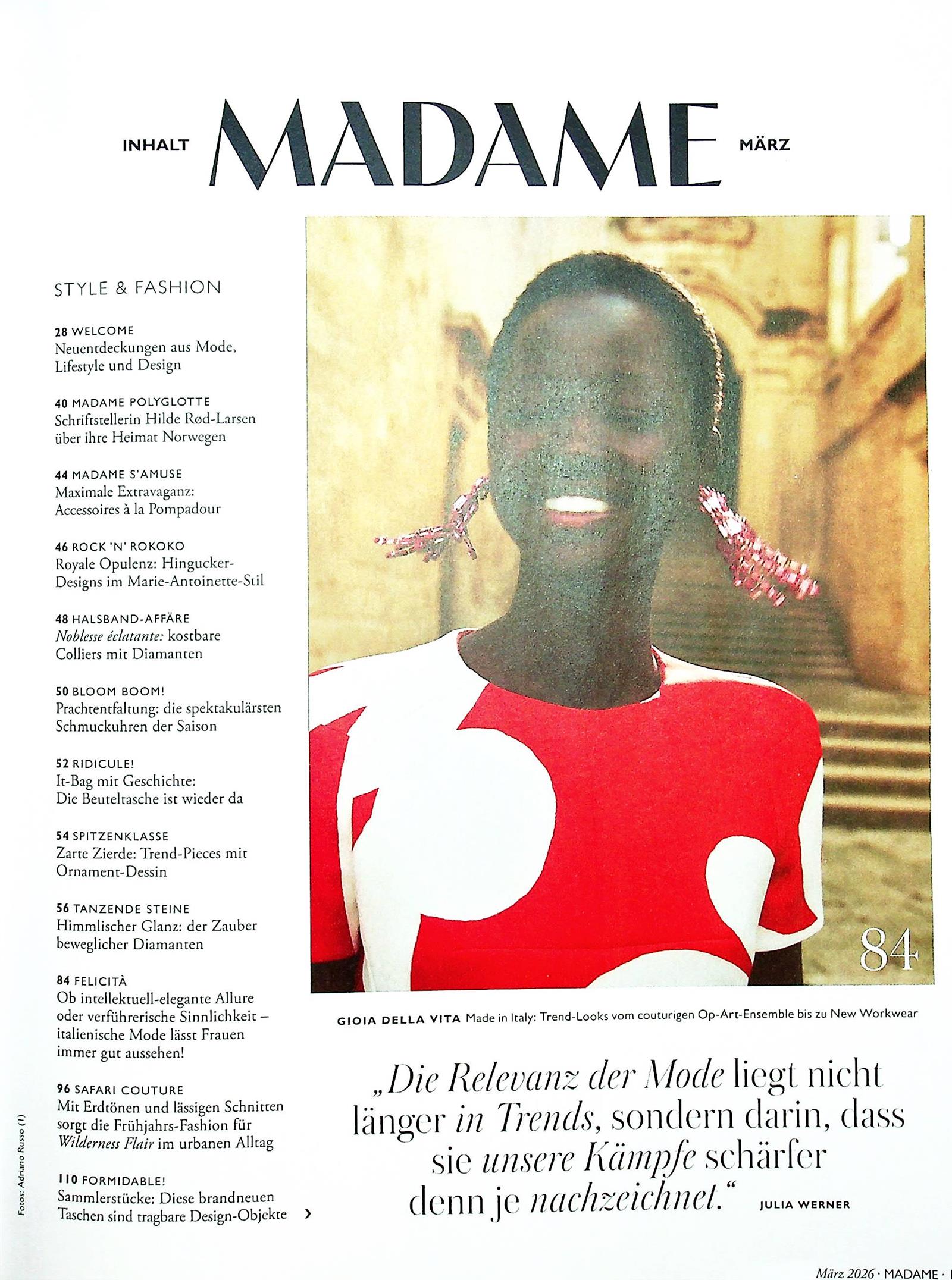 Die Anrede „Madame“- in Frankreich ganz natürlich in den Alltag integriert - findet im deutschsprachigen Raum eher selten Eingang in den Sprachgebrauch. „Madame“ hat hier die Konnotation von elegant, charmant, ein bisschen kapriziös, eigenwillig, weltoffen, auch unkonventionell und bestens mit dem gesellschaftlichen Parkett vertraut, auf dem man Themen wie Geld, Sex und Politik tunlichst meidet und über Abwesende (und Anwesende) nicht oder eben nur sehr leise spricht. Umso schöner, wenn ein Heft sich dieser eleganten Ansprache annimmt und mit dem Titel Madame schon mal die Tendenz des Heftes klar macht.