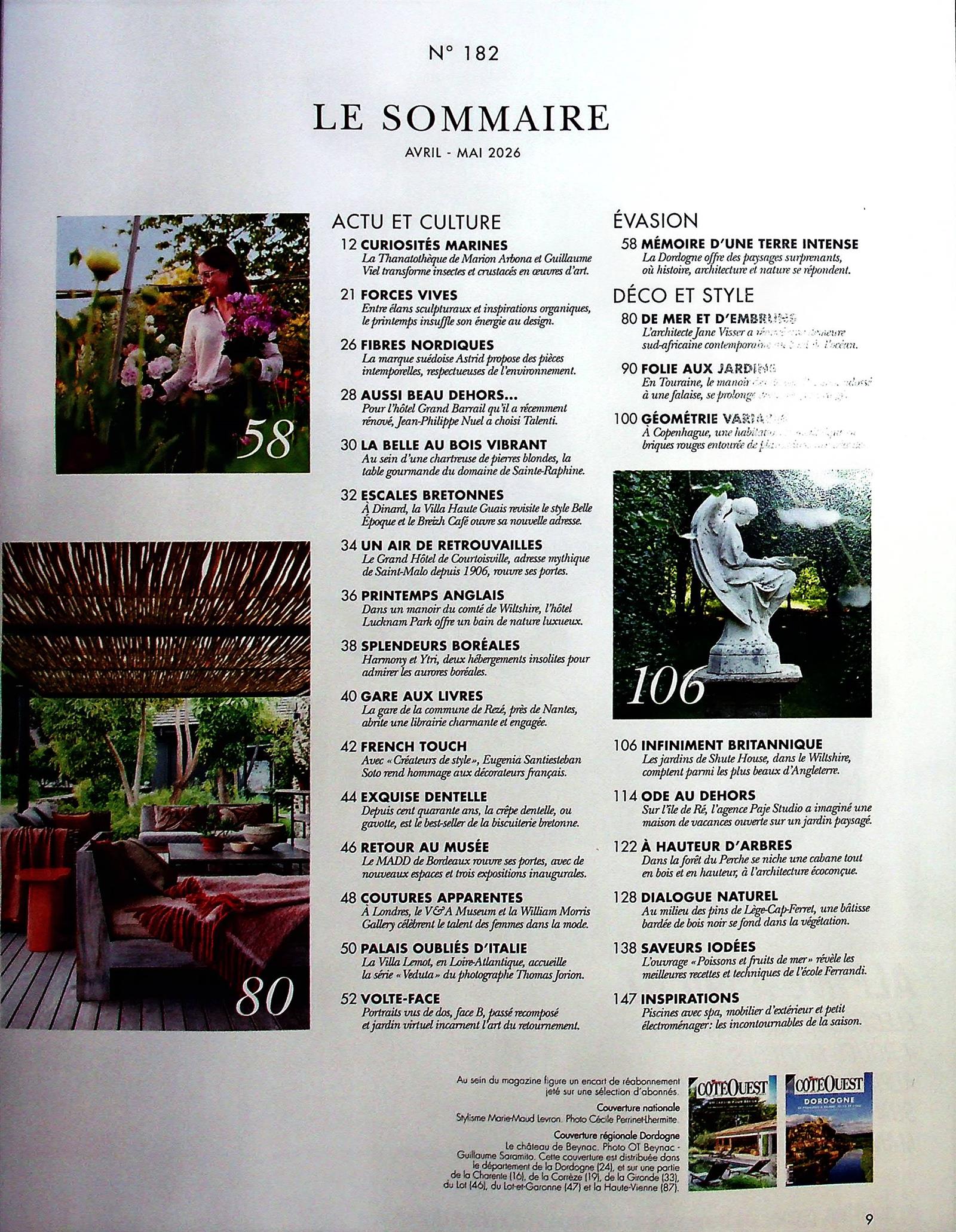 Maisons côté Ouest zählt zu einem internationalen Magazin der Extraklasse. Der Fokus des Magazins liegt auf den schönsten Interieurs der französischen Atlantikküste. Wohnreportagen stehen natürlich an erster Stelle, sowohl über private Häuser und Appartments als auch über ganz besondere Hotels und Gasthäuser. Eine Gartenreportage hier und da lockert das Magazin auf, sowie wenige aber leckere Rezepte. Außerdem gehört Kunst zu den Inhalten des Magazins: örtliche Ausstellungen, Kunst mit örtlichem Bezug oder Künstler der Atlantikküste.
