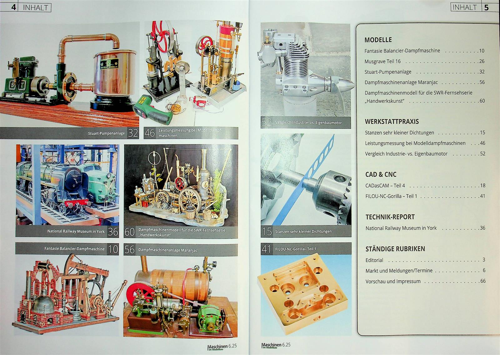 Die Maschinen im Modellbau berichtet über den technischen Modellbau und den Selbstbau von Dampfmaschinen, Motoren aller Art, Düsentriebwerken sowie über Werkstoff- und Werkzeugkunde. Umfangreiche Informationen zu Bearbeitungsmaschinen von Modellbaumaterialien runden das Magazin ab.