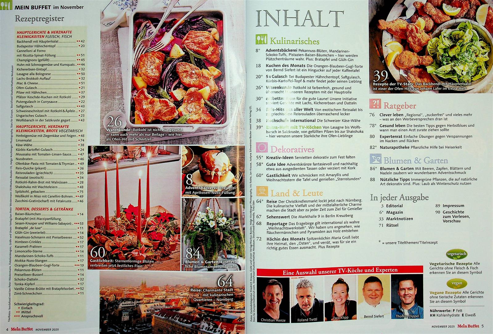 Blättert man die Seiten von Mein Buffet durch, läuft einem regelrecht das Wasser im Mund zusammen, denn das Magazin präsentiert zahlreiche Koch- und Backideen. Es überzeugt dabei mit einer großen Bandbreite – vom Küchenklassiker, über das preiswerte Rezept für jeden Tag, bis hin zum leckeren Kuchen für die Nachmittagstafel. Zudem begleitet das Magazin die beliebtesten TV-Köche. In einem Extra-Beihefter werden ihre kulinarischen Kreationen gesammelt präsentiert.