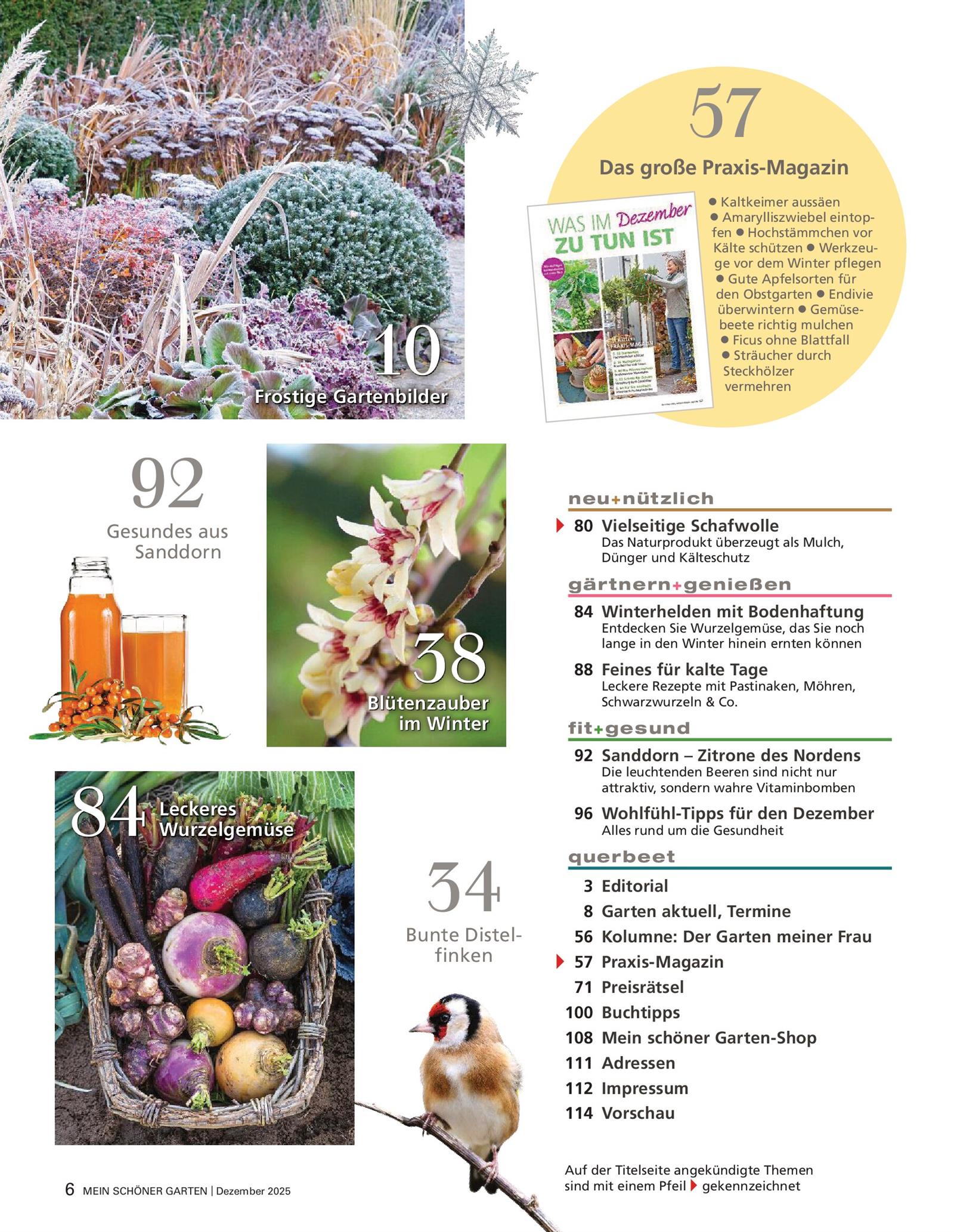 Das redaktionelle Konzept der Mein schöner Garten Zeitschrift vereint Inspiration, Information und praktischen Nutzen. Jede Ausgabe bietet Pflanzenporträts, saisonale Pflegeanleitungen, Gestaltungsideen für Beete, Balkone und Terrassen sowie Schritt-für-Schritt-Anleitungen zum Selbermachen. Ergänzt werden die Inhalte durch Ratgeber zu Naturgärten, Selbstversorgung, Kräuterkunde, Gartentechnik und nachhaltigem Gärtnern. Produktempfehlungen, Buchtipps, Veranstaltungshinweise sowie Rezepte mit Obst und Gemüse aus dem eigenen Garten runden das Heft ab. Damit spricht das Magazin alle an, die ihren Garten als Ort der Ruhe, Kreativität und Lebensfreude gestalten möchten.