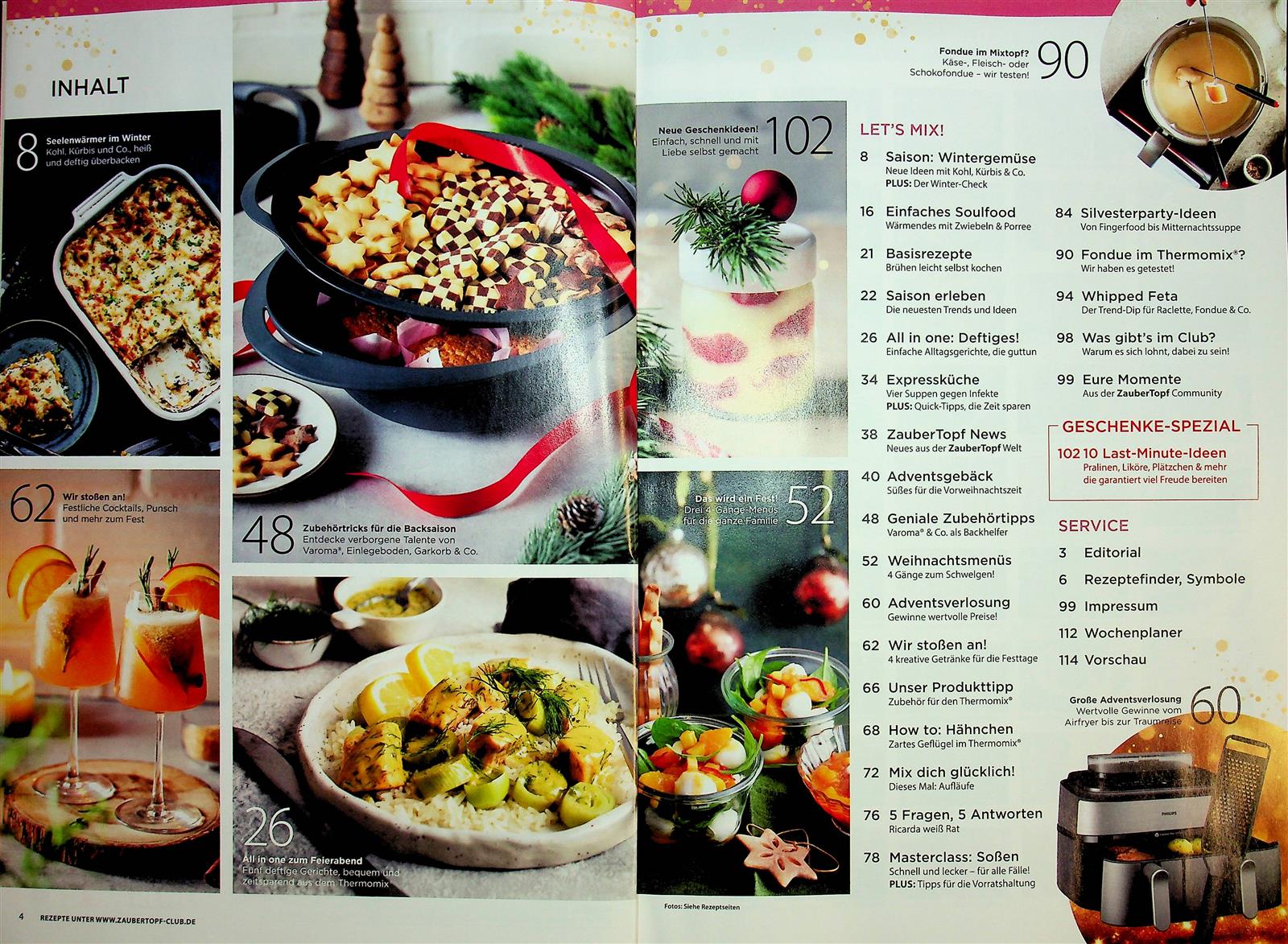 Der Thermomix®, eine Multifunktionsküchenmaschine der Vorwerk Gruppe. Sie kann nicht nur Lebensmittel zerkleinern und mixen. Auch Essen erwärmen und Gerichte kochen ist mit ihr möglich. Doch was eignet sich für den Thermomix®? Welche Gerichte gehen leicht von der Hand? Was passt zur alltäglichen Küche? Was für den besonderen Anlass. Die Zeitschrift Mein Zaubertopf enthält Rezepte, die speziell für den Thermomix® entwickelt wurden.
