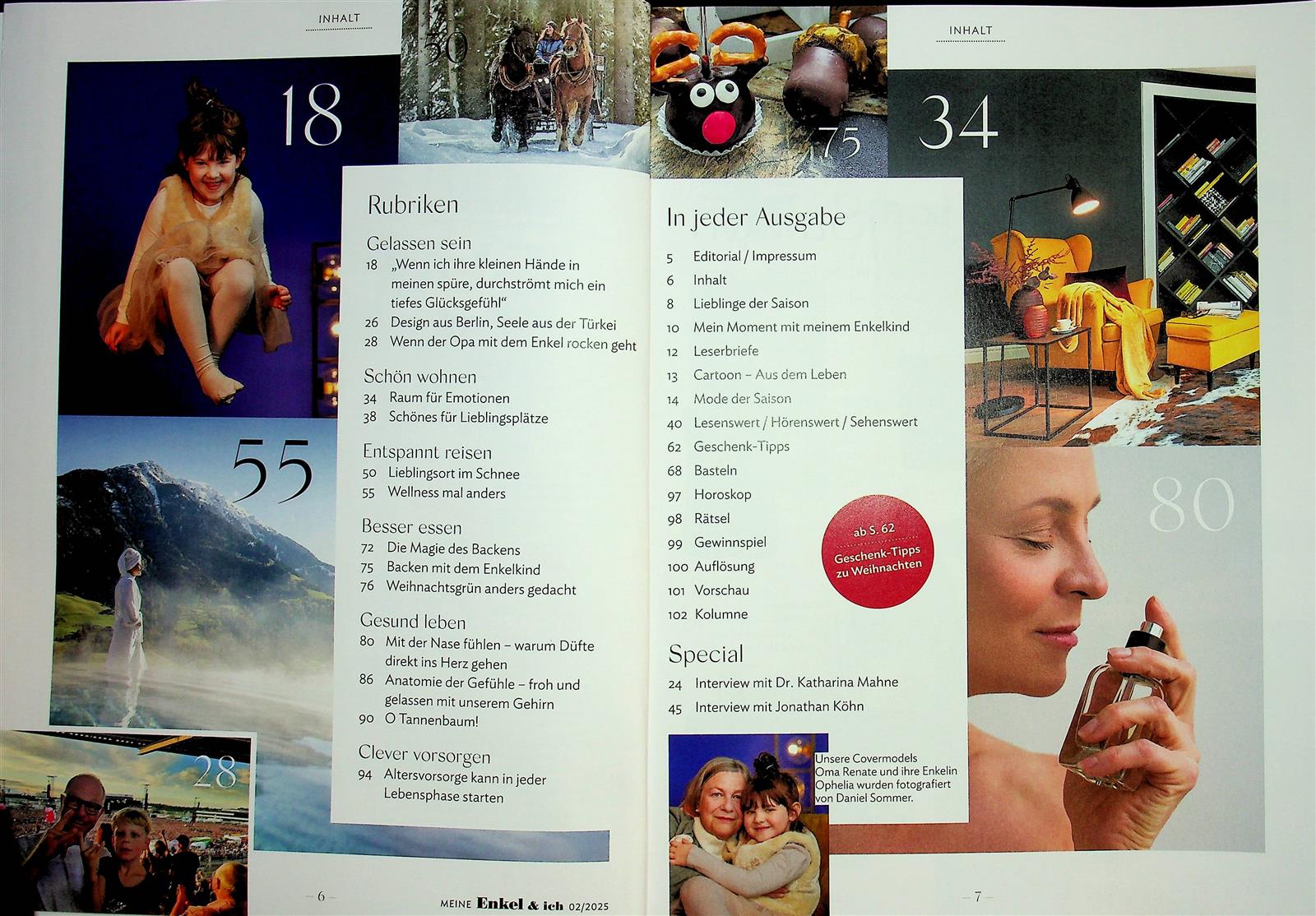 Das Magazin Meine Enkel & ich gibt interessante und anregende Tipps, wie man als Großeltern am besten für die Enkelkinder da sein und die gemeinsamen Momente mit ihnen genießen kann. Das Magazin bringt Beiträge aus sechs Rubriken, welche regelmäßig in jedem Heft besprochen werden: Gelassen sein, Besser essen, Clever vorsorgen, Entspannt reisen, Gesund leben und Schön wohnen. Außerdem finden Sie Geschenktipps für alle Altersgruppen von Enkelkindern sowie spannende und lesenswerte Beiträge aus dem modernen Leben, zum Beispiel zum Thema Großeltern in einer Patchwork-Familie.