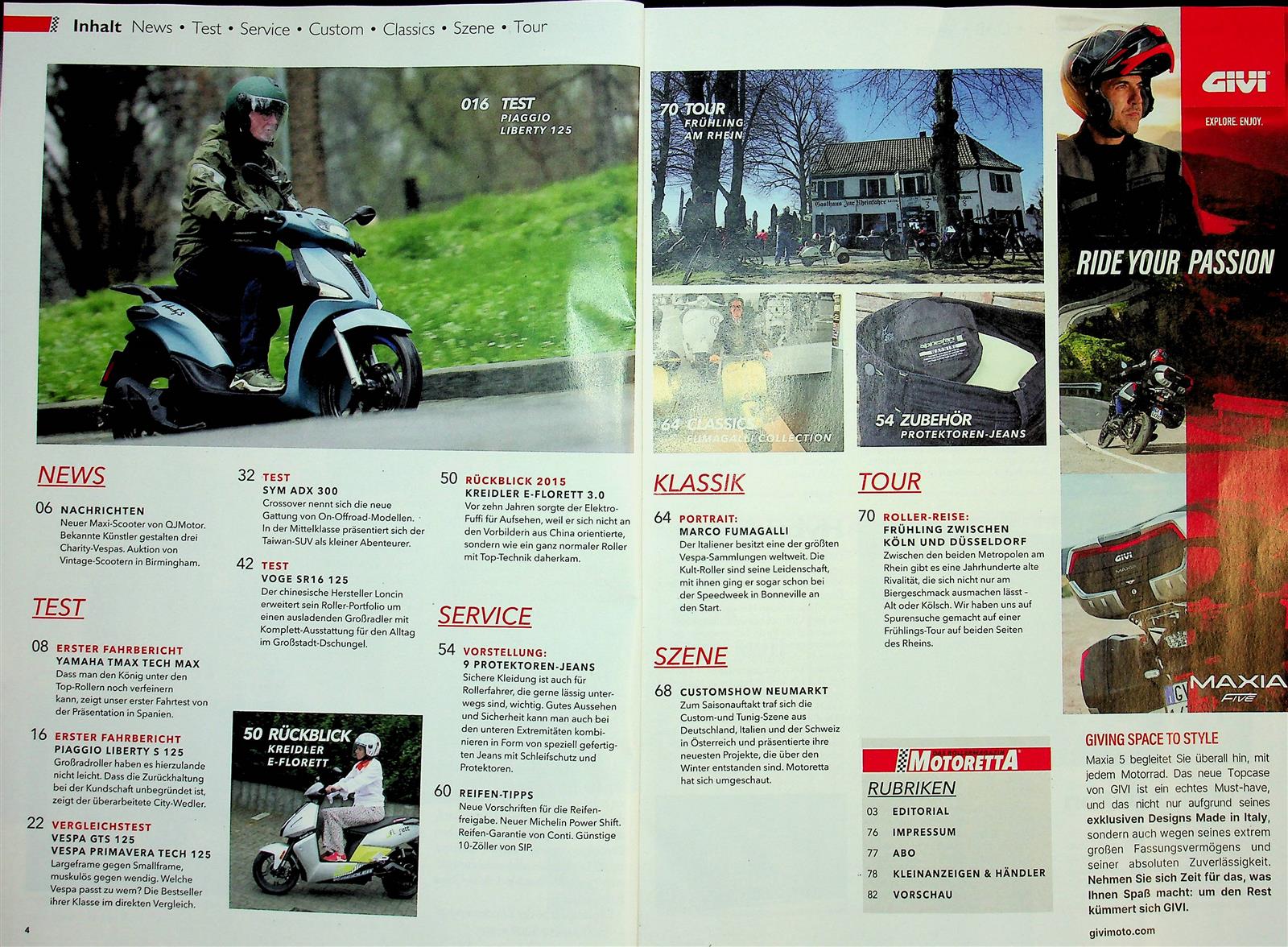 MOTORETTA im Abo: Die vielfältige Motorroller-Zeitschrift MOTORETTA zählt zur ersten, deutschen Motorroller-Zeitschrift. Seit über 20 Jahren berichtet die Zeitschrift über die aktuellsten Themen rund um das motorisierte Zweirad. Hierzu gehören Produktvorstellungen, Vergleiche, Sicherheitstests sowie eine informative Berichterstattung. Das Portfolio der Zeitschrift wird abgerundet durch zahlreiche Sonderpublikationen beispielsweise des Vespa Magazins.