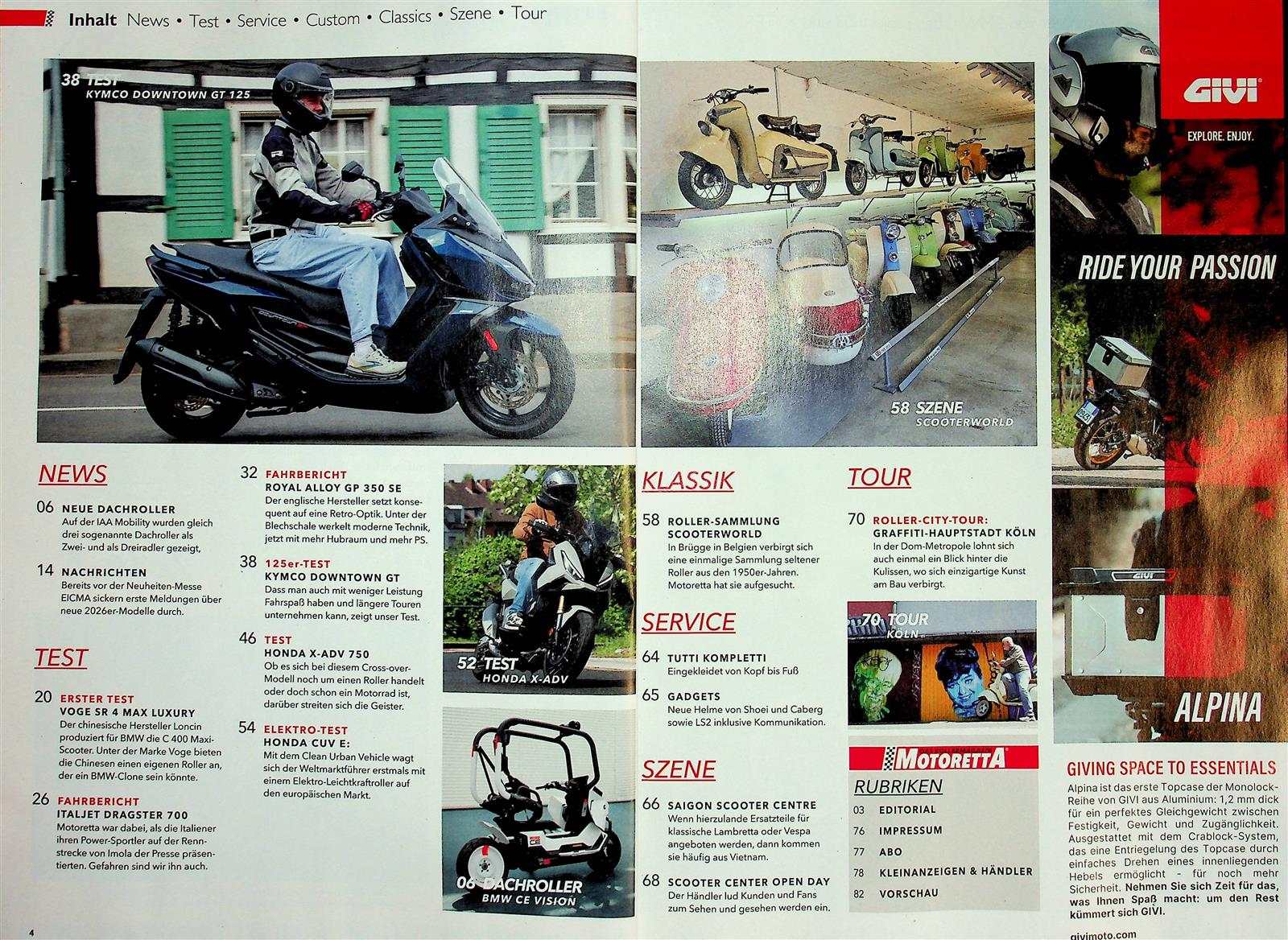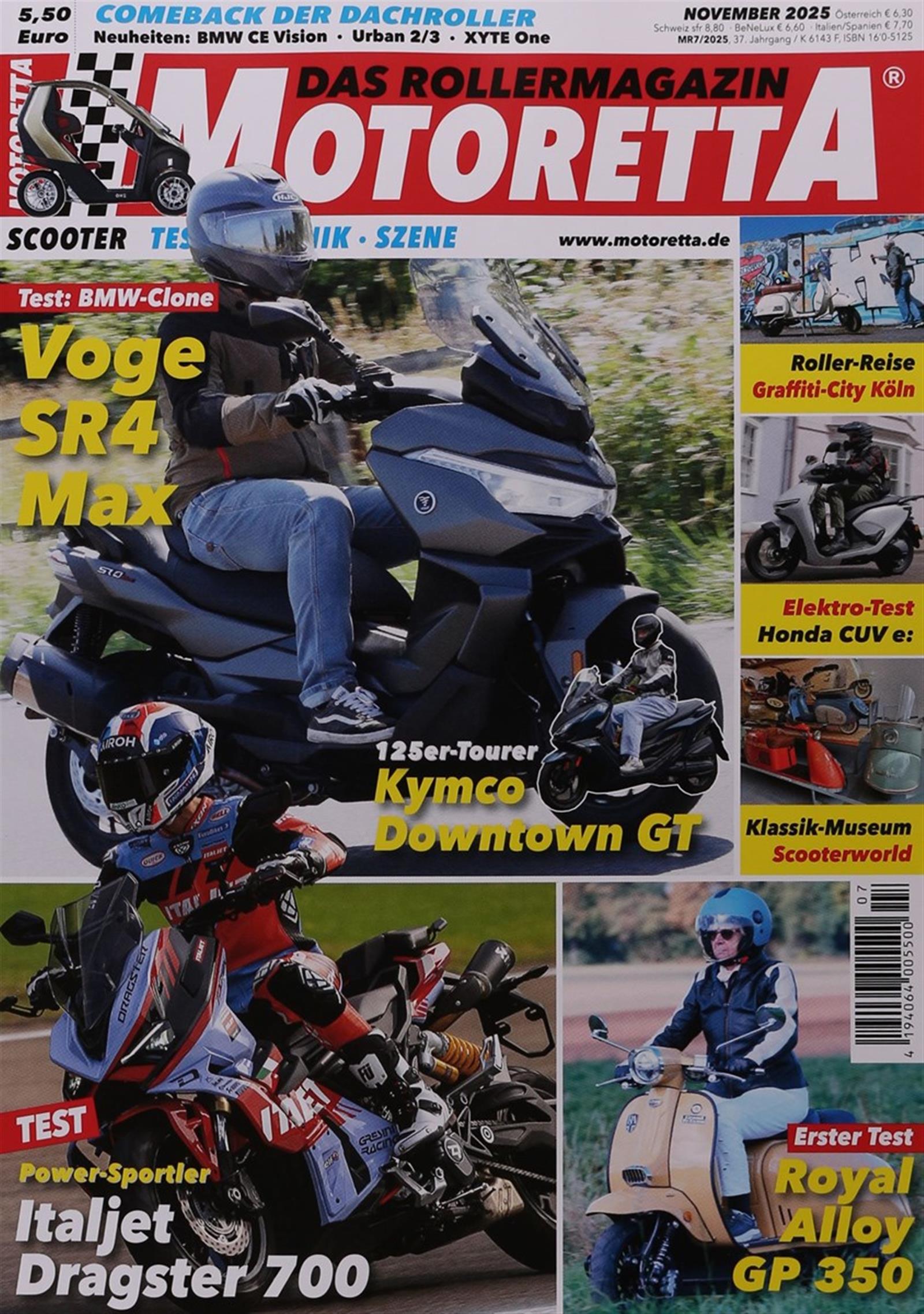 Zum Sommerstart gibt es neue Roller-Modelle: vom Voge SR1 125 ADV bis zum überarbeiteten Kymco Downtown 350 GT. Der SYM ADXTG 400 überzeugt im Gelände, der Kymco Sky Town 125 punktet bei Einsteigern. Yamaha bringt den verbesserten XMAX 300, die e-Schwalbe kehrt zurück. Plus: 11 Sneaker-Modelle und eine Sizilien-Reportage rund um den Ätna.