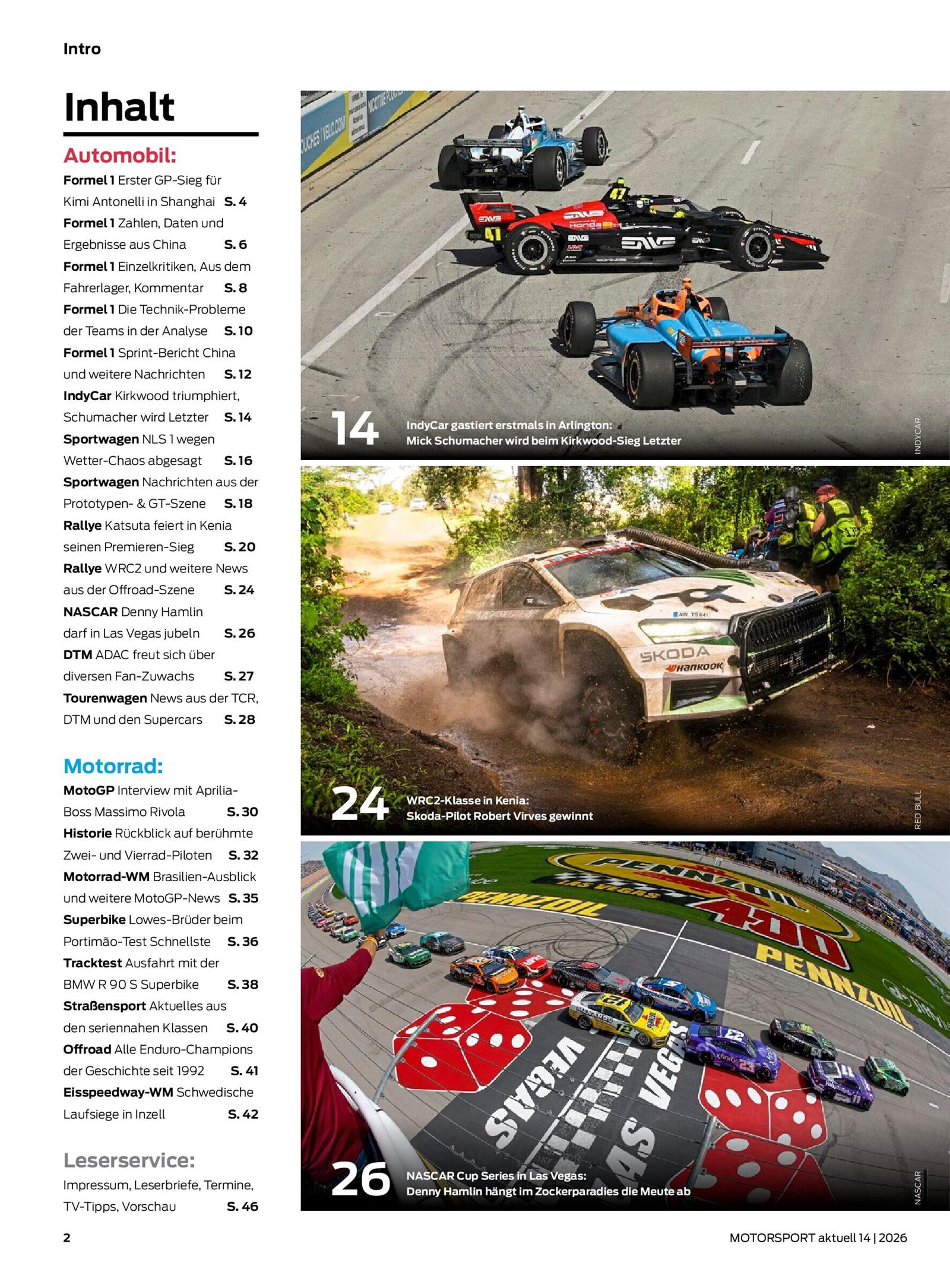 Wie es der Name bereits sagt, dreht sich in der MOTORSPORT aktuell alles um röhrende Motoren und benzingeschwängerte Luft. Dabei wirft das Magazin immer wieder Blicke hinter die Kulissen und informiert beispielsweise über Formel 1- Technik oder auch über die Geschehnisse in den einzelnen Rennställen. Des Weiteren wird auch dem Breitensport viel Raum gewidmet, wobei auch Rennstrecken porträtiert oder Veranstaltungen angekündigt werden. Ebenfalls geht es um historische Themen wie beispielsweise eingestellte Rennserie und mehr.