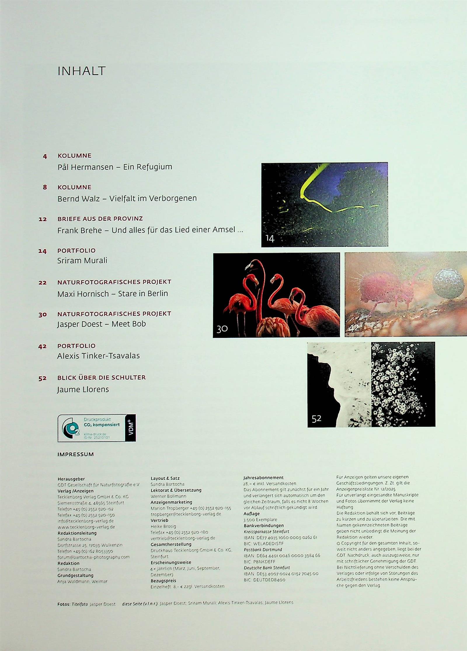 Wer den Spreewald erkunden möchte, begibt sich am besten aufs Wasser – so wie es unser Autor Ralf Antes getan hat. Thomas Bannenberg hat sich beim »Muck diving« im dunklen Sand vor Bali auf die Suche nach fremdartig anmutenden Tierchen gemacht. Claude Flueckiger beschäftigt sich seit Jahrzehnten mit Wildbienen und gibt Tipps, wo man sie finden und fotografieren kann. Guido Sachse porträtiert die Grasnelke und ihre tierischen »Bewohner« über einen langen Zeitraum und zeigt uns seine Ergebnisse. Die rauen, von Wasser und Fels geprägten nordischen Landschaften waren es, die Michael Jaeschke zur Schwarzweiß-Fotografie zurückzukehren ließen. Mario Müller hat ein erfolgreiches Ökotourismus-Projekt im ecuadorianischen Regenwald besucht. Hans-Peter Schaub hat die ungewöhnliche und minimalistische Sigma BF sowie Nikons Superzoomkamera, die P1100, für uns getestet.