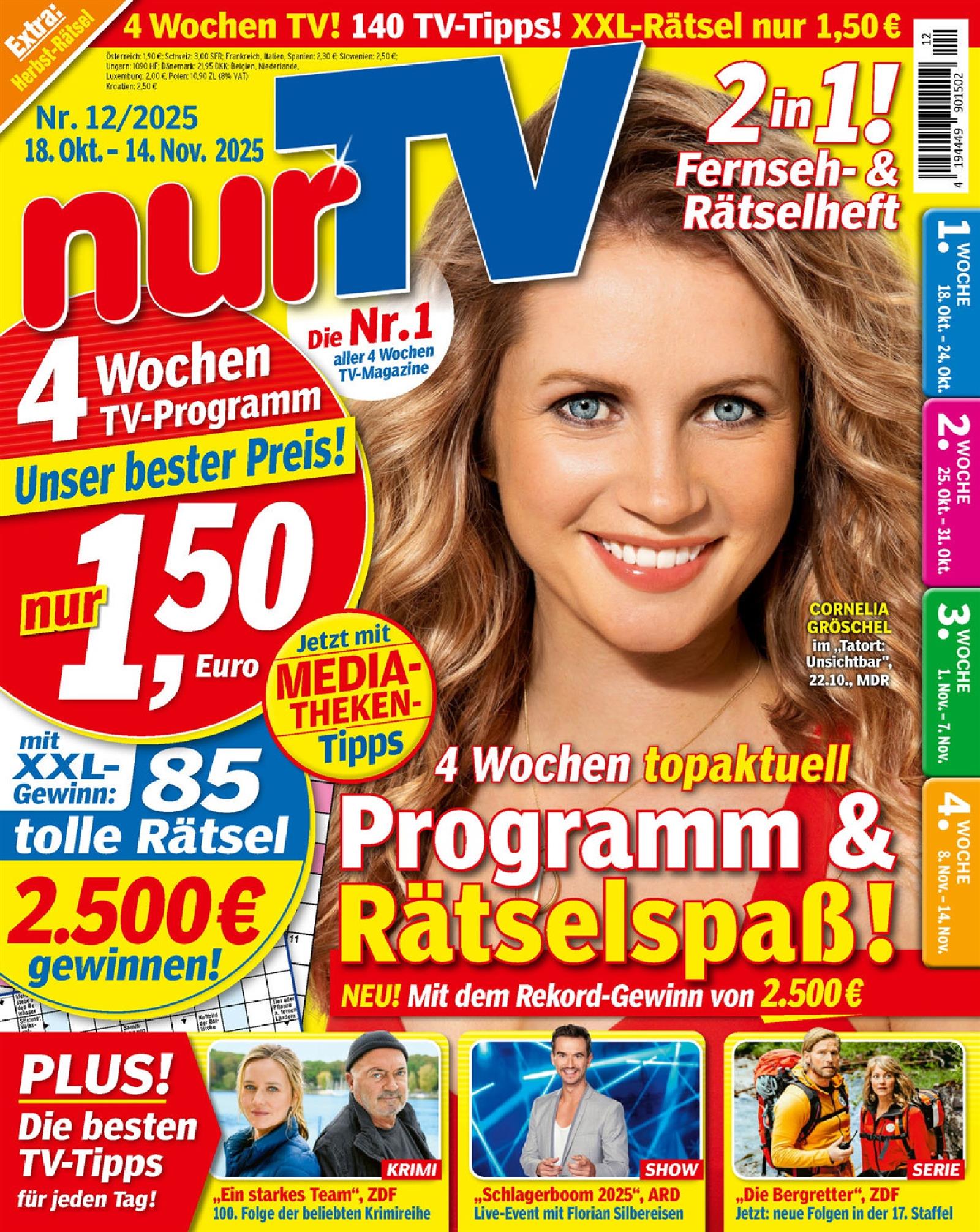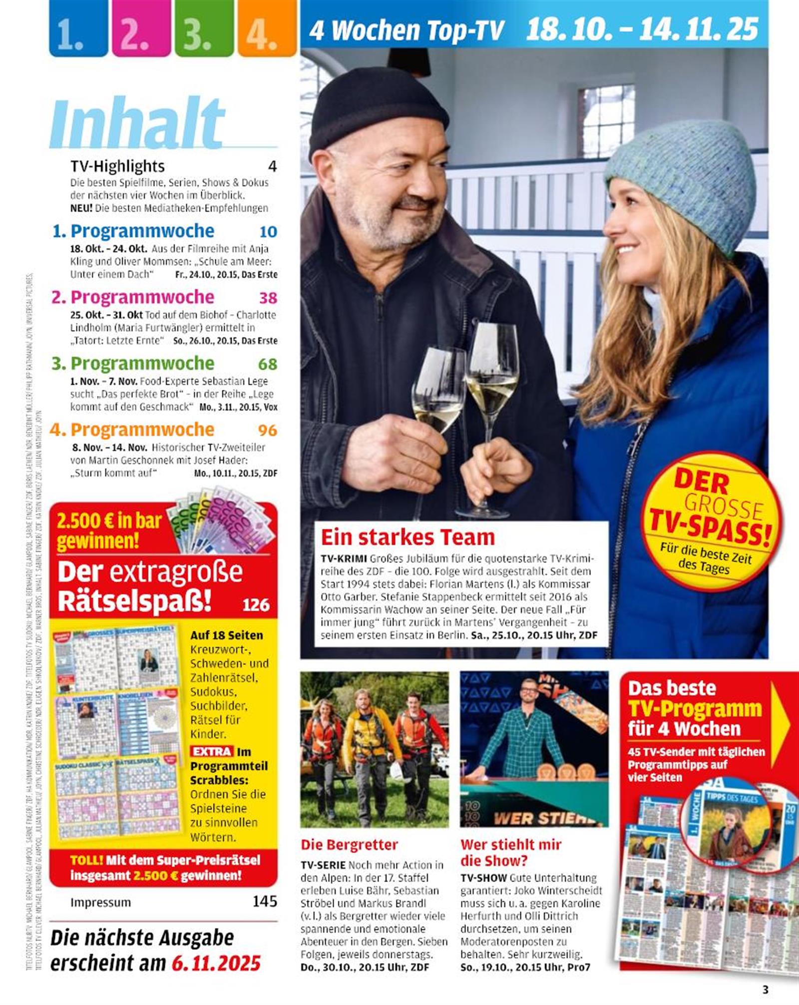 Die Zeitschrift präsentiert die besten TV-Highlights der kommenden Wochen mit Filmen, Serien, Shows, Dokus und Mediatheken-Tipps. Jede Programmwoche bietet besondere Sendungen wie Krimis, Kochformate und Unterhaltungsshows. Ergänzt wird das Heft durch ein großes Rätsel-Spezial mit Gewinnspielen und eine Vorschau auf kommende TV-Empfehlungen.
