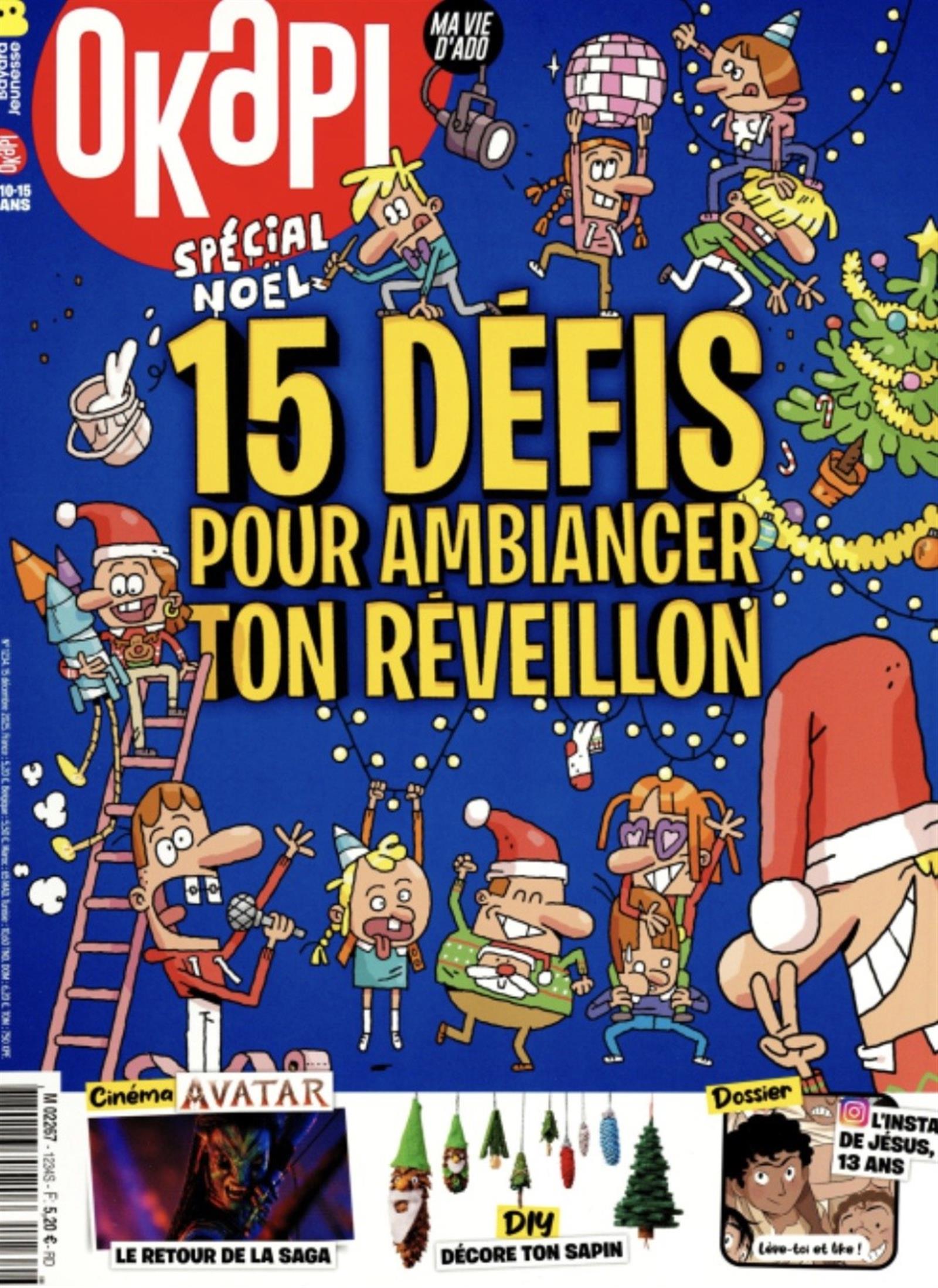 Numéro spécial Noël d’Okapi : 15 défis délirants pour mettre l’ambiance au réveillon. Au programme aussi, le retour d’Avatar au cinéma, des idées DIY pour décorer le sapin et un dossier malin sur « Jésus sur Instagram ». Festif, drôle et plein d’énergie.