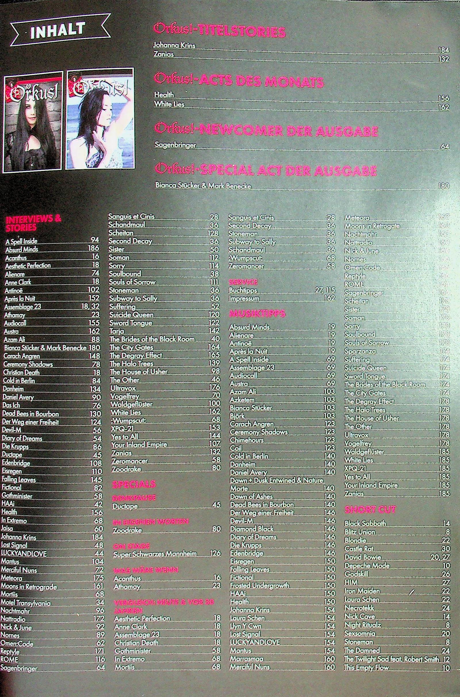 Der Klassiker und Trendsetter unter den Gothic-Magazinen hört auf den Namen Orkus. Galten die Musik-Genres Gothic, Wave, Elektro und Industrial anfangs zu den bestimmenden Themen, änderte sich die Ausrichtung und verlagerte den Themenschwerpunkt auf das Metal-Umfeld. Heutzutage steht das Magazin für die kommerziell erfolgreichen Genres wie Metal, Neue Deutsche Härte oder Mittelalter-Rock und deckt Bands sowie Festival der „Schwarzen Szene“ ab – ein Muss für alle Fans.