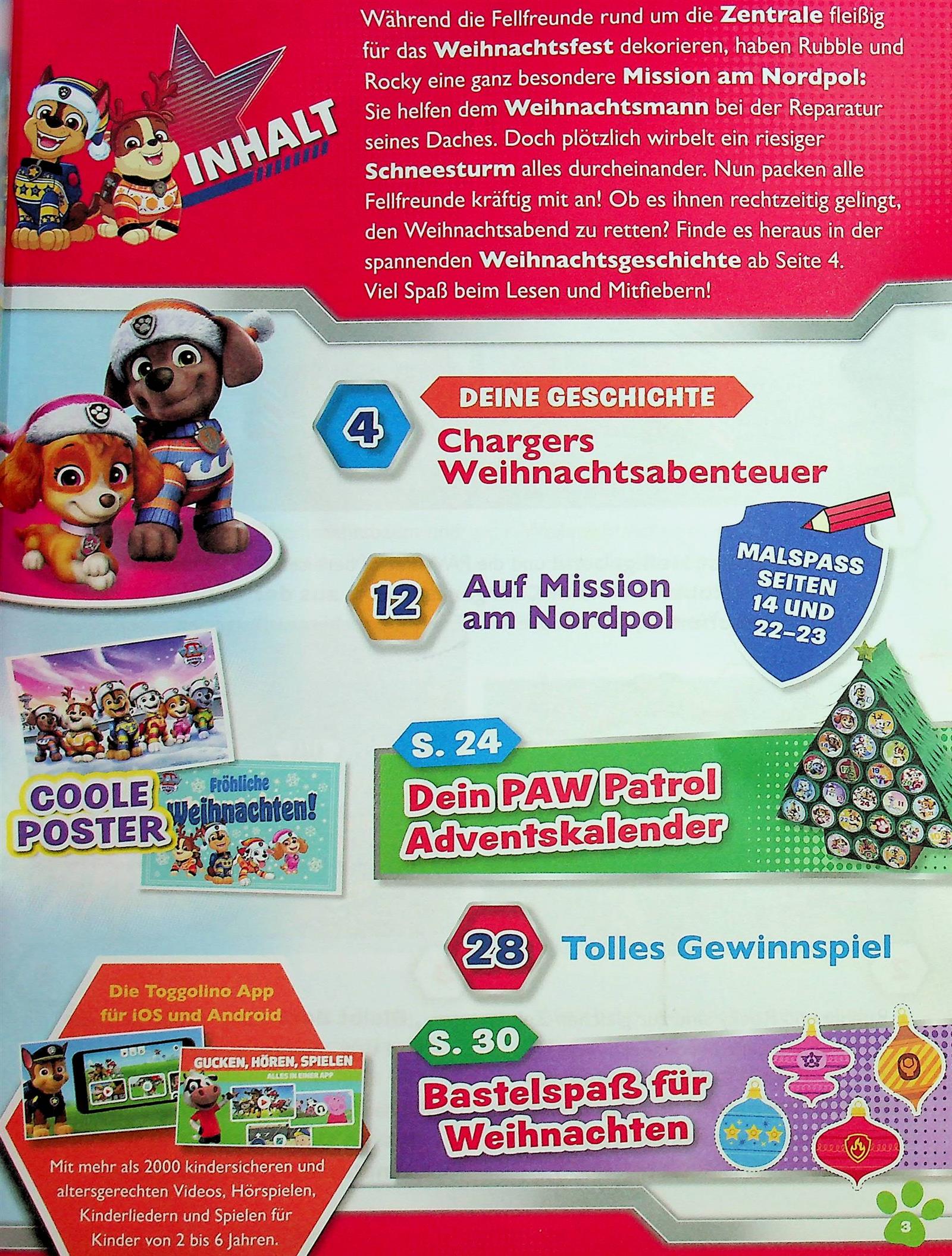 Diese Ausgabe enthält eine spannende Weihnachtsgeschichte rund um Chargers Abenteuer sowie eine Mission der Fellfreunde am Nordpol. Dazu gibt es bunte Malspaß-Seiten, ein großes Weihnachts-Poster und einen eigenen PAW-Patrol-Adventskalender. Ein tolles Gewinnspiel lädt zum Mitmachen ein, und kreative Bastelideen sorgen für zusätzlichen Weihnachtsspaß. Viel Spaß beim Entdecken!
