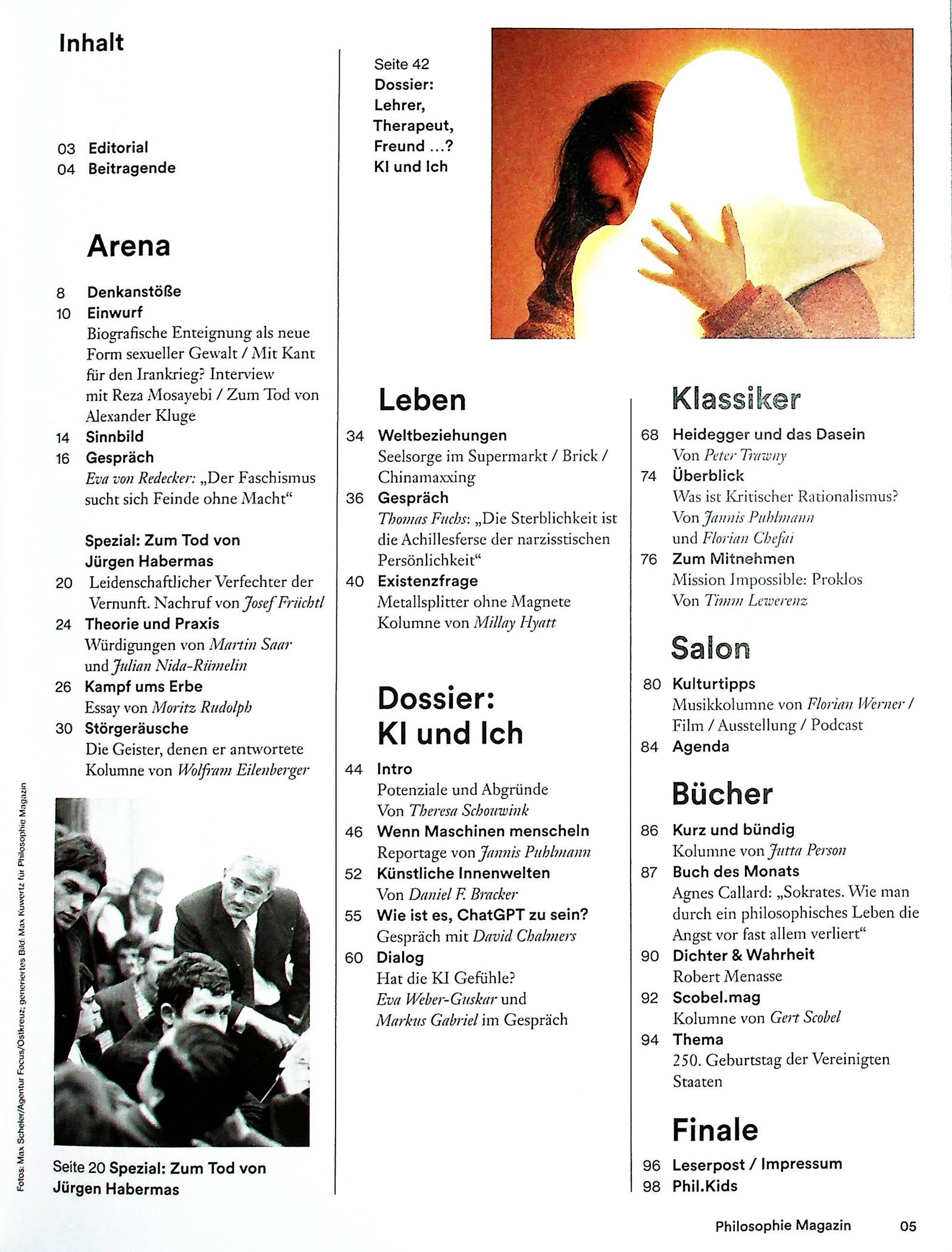 Das Philosophie Magazin beweist alle zwei Monate, dass sich das Nachdenken über Themen der Gesellschaft, Politik oder Philosophie keineswegs auf elitäre Zirkel oder die Universitäten beschränken muss. Die Zeitschrift existiert seit Ende 2011.