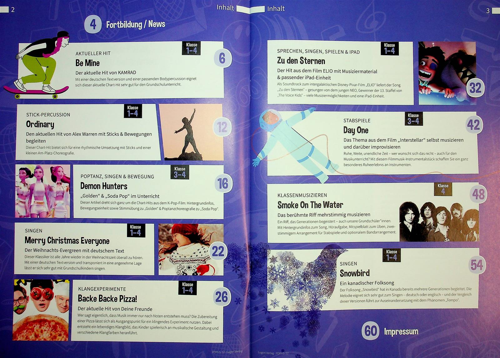 Chart-Hits, beliebte Kinderlieder oder Youtube-Phänomene und die Lieblingssongs der Schüler – das alles wird in Popmusik in der Grundschule gründlich und unterhaltsam analysiert. Der Inhalt umfasst zudem Leadsheet, Mitspielsätze und Play-backs für umfangreiches Bildungsmaterial, welches mit Spaß kombiniert wird, damit das Lernen nie langweilig wird. Außerdem bietet das Magazin spannende Choreografien, thematische Auseinandersetzungen mit dem Liedtext, Klassenmusizieren oder kreatives Gestalten. Die Schüler werden von Popmusik in der Grundschule definitiv begeistert sein und gewinnen dadurch großes Interesse am Musikunterricht!
