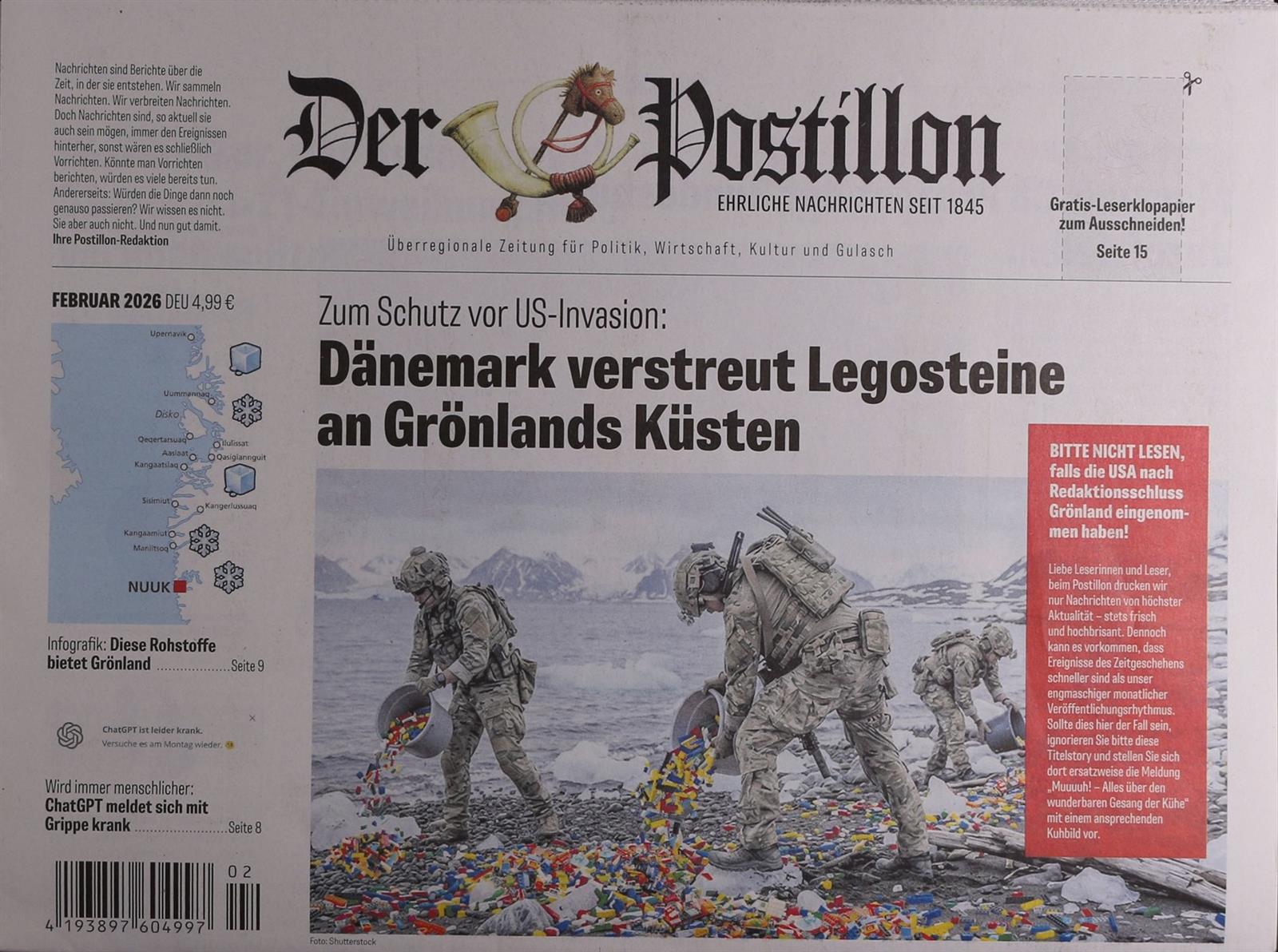 Nach wiederholten Drohungen der US-Regierung gegen Grönland geht Dänemark nun auf Nummer sicher: Das dänische Militär hat heute damit begonnen, großflächig Legosteine an den Küsten der arktischen Insel auszubringen. So soll eine mögliche Invasion durch US-Truppen verhindert werden.