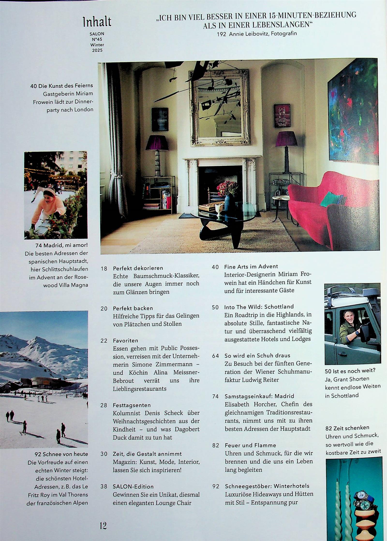 Hier wird Aktuelles aus der Food- und Designbranche zum Besten gegeben, besonderer Schmuck beleuchtet, ausgewählte exklusive Möbel recherchiert oder wunderbare Parfüme vorgestellt. Ebenso hält die Redaktion Tipps zu Büchern und Ausstellungen bereit sowie zu neuen Hotels und Restaurants. Beim Tischgespräch porträtiert das Magazin interessante Menschen und entlockt ihnen ihre Geheimnisse rund um das Einladen, wo sie einkaufen und wohin sie verreisen. Hoteliers berühmter Grand-Hotels beschreiben ihre Philosophie von Gastlichkeit.