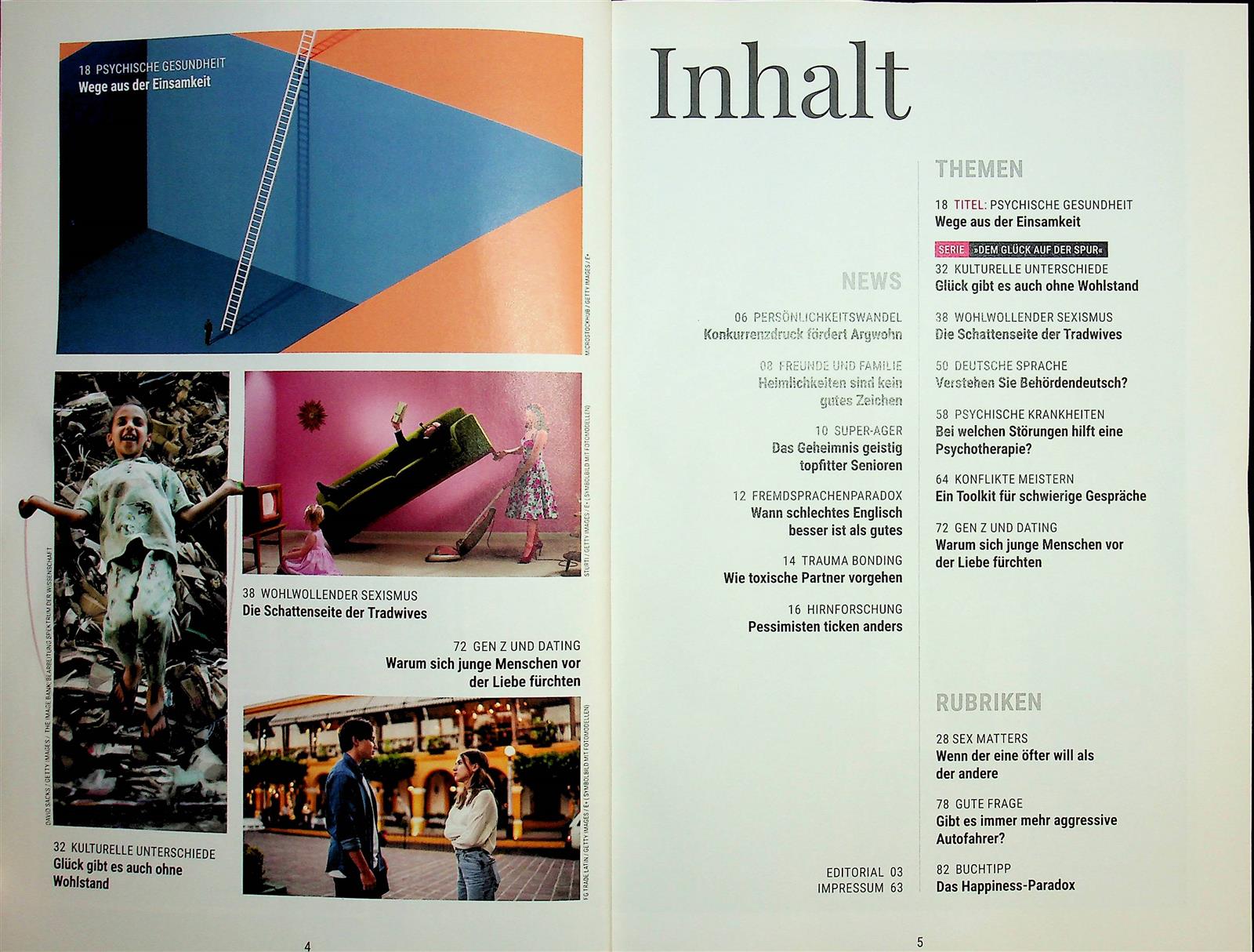 Spektrum Psychologie erscheint seit 2018 und bringt tiefere Einsicht in das menschliche Miteinander, mehr Orientierung in aktuellen gesellschaftlichen Fragen sowie gute Impulse für ein selbstbestimmtes Leben.