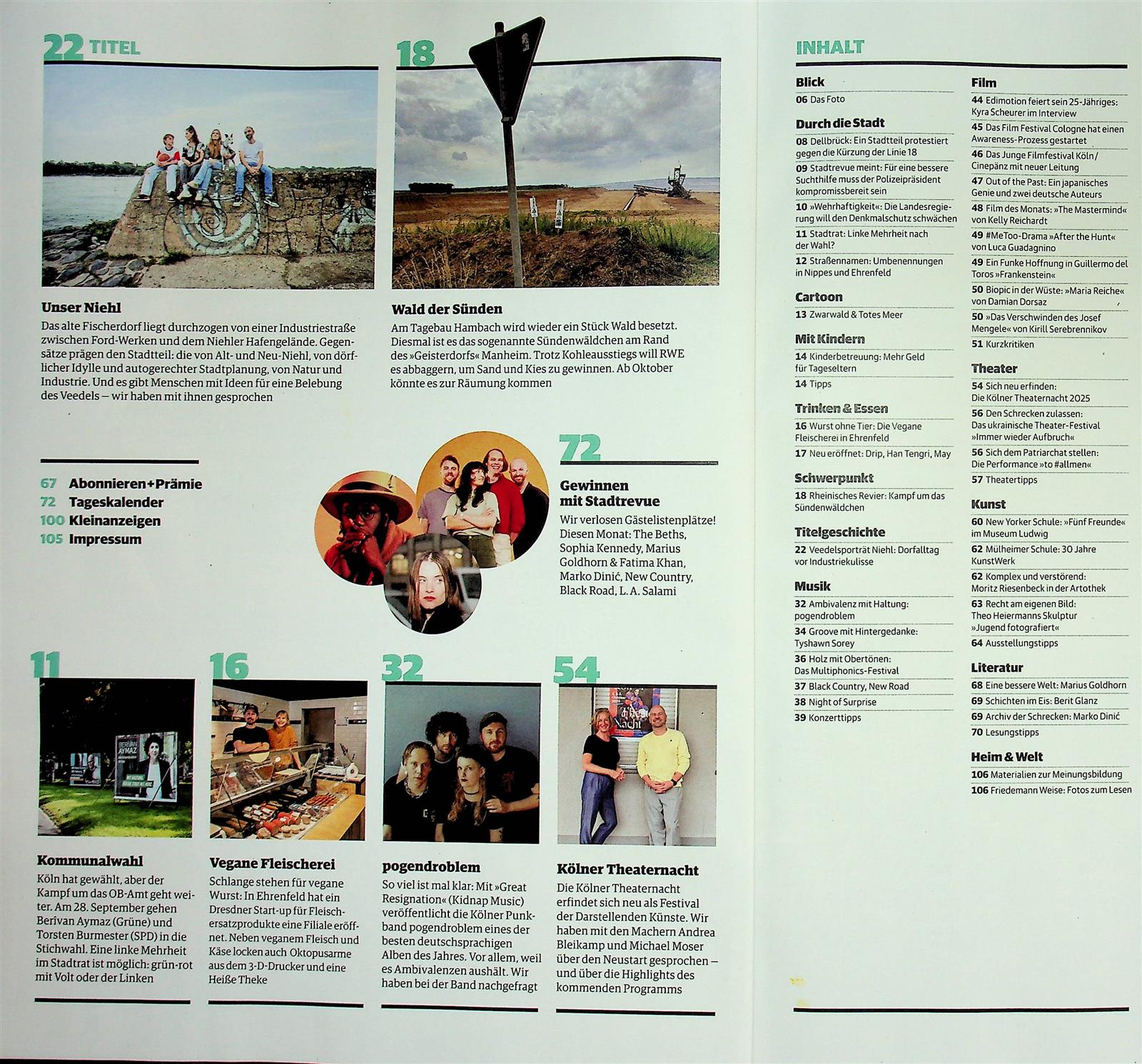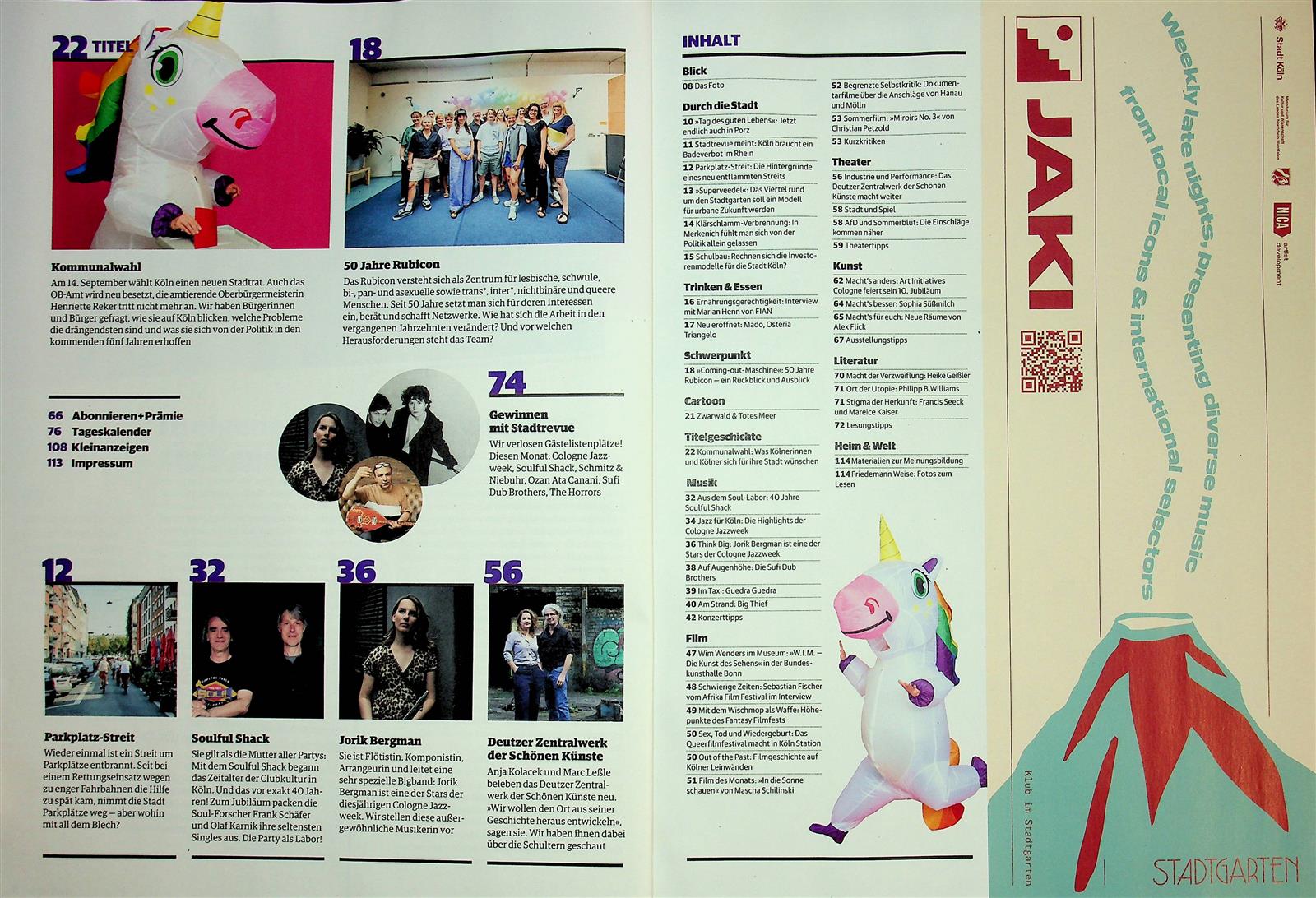 Ein breites Themenspektrum, aber immer mit Kölnbezug – die Stadtrevue stellt auf rund 150 Seiten Monat für Monat Kultur, Politik und Stadtleben der Domstadt zusammen, informiert ihre Leser, was in den kommenden vier Wochen Gesprächsthema der Stadt ist, welcher Event nicht verpasst werden sollte und was die Gastro-Szene an Überraschungen bereithält.