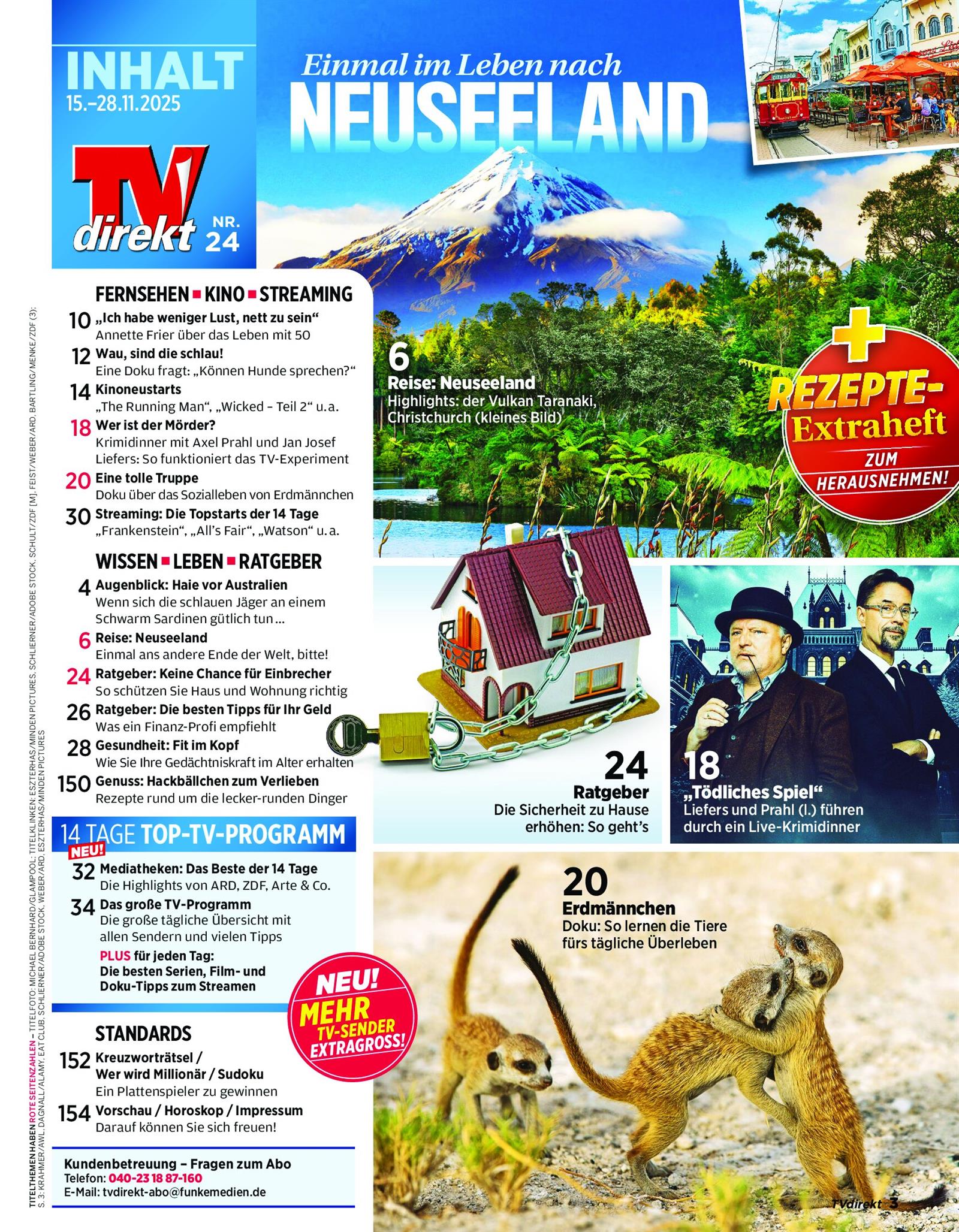 Wann läuft das nächste Spielfilm-Highlight und ist die Lieblingsserie noch auf ihrem angestammten Sendeplatz? Ein guter Programm-Guide hilft, das wirklich Interessante im TV zu finden. Die TV direkt ist eine der populärsten TV-Zeitschriften.