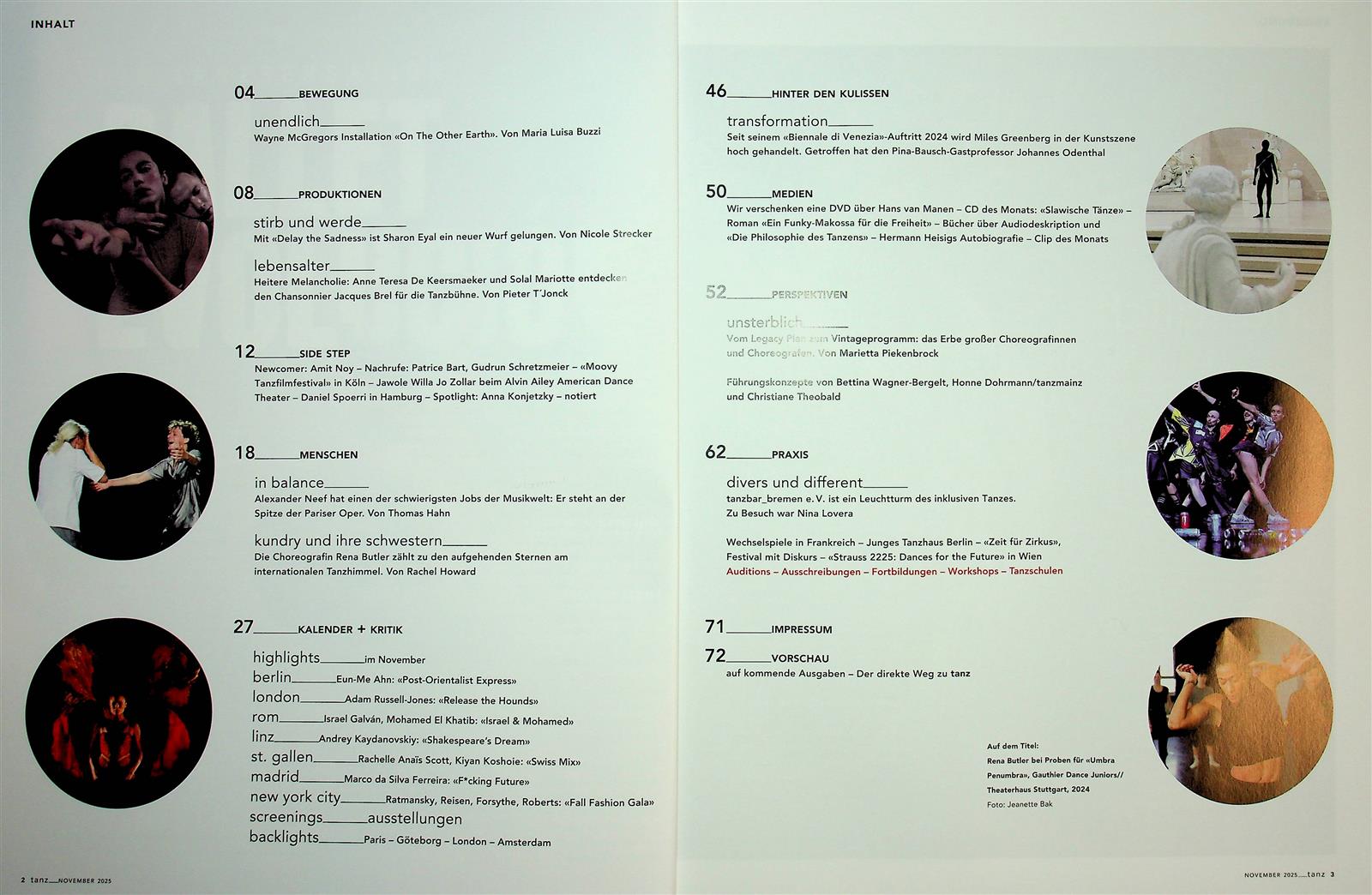 Das Jahrbuch von Tanz widmet sich jeweils einem zentralen Thema und ermittelt in einer international angelegten Umfrage die wichtigsten Produktionen, Choreografen, Tänzer und Kompanien der vergangenen Saison.
