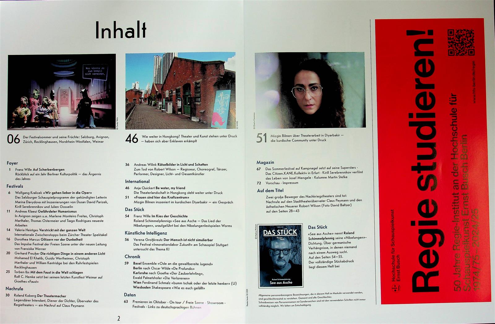 Ob Theatermacher oder Liebhaber der Schauspielkunst: wer informiert sein möchte über Premieren, Schauspieler und Schauspielerinnen, Künstler und Musiker der Branche, findet in diesem Magazin alle wichtigen Informationen.
