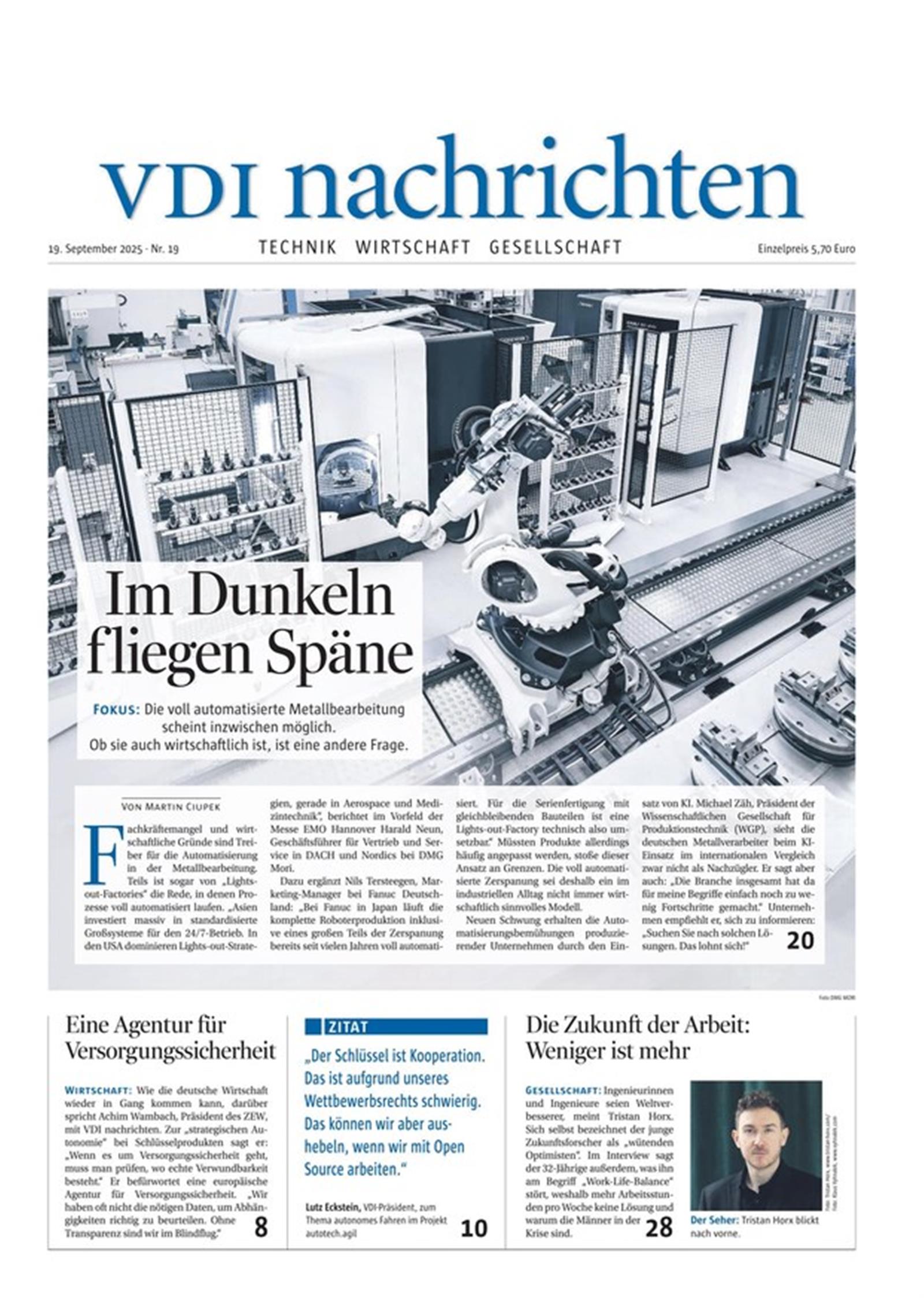 VDI nachrichten ist die Wochenzeitung der Ingenieure und Deutschlands meinungsbildende Medienmarke zu Technik, Wirtschaft und Gesellschaft. Mit selbst recherchierten Artikeln und exklusiven Wochenschwerpunkten unterschei-det sich VDI nachrichten thematisch stark vom Wettbewerb und steht für journalistische Exzellenz im Zeitalter der industriellen Transformation und Digitalisierung. Der Fokus liegt dabei auf den produzierenden und verarbeitenden Industriesegmenten. Schlüsseltechnologien aus der Produktions-technik, der vernetzten Produktion, der Automatisierungstechnik, der Produkt- und Prozessgestaltung, der Fahrzeug- und Verkehrstechnik und den Energieindustrien sind weitere Themenschwerpunkte. Der digitale Zugang Vn+ ist automatisch im Print-Abo inklusive.