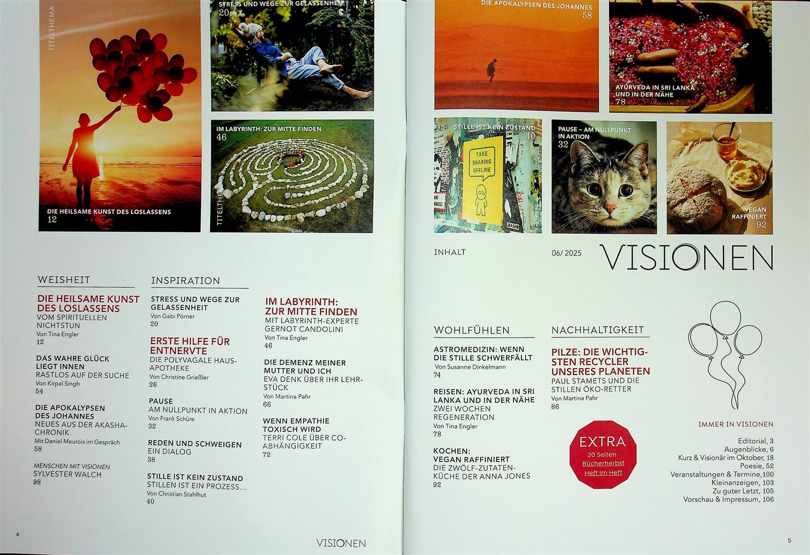 Visionen beschäftigt sich mit Themen wie ganzheitliche Lebensgestaltung, Bewusstseinsentwicklung und Nachhaltigkeit. Das Magazin zeichnet sich durch ein breites Themenspektrum aus. Sowohl die Rubriken Gesundheit und Wellness, Ernährung und Ökologie als auch Bewusstsein und gelebte Spiritualität sind fester Bestandteil des Magazins. Ausführliche und anspruchsvolle Beiträge aus den Bereichen Astrologie, Philosophie, Mystik, Wissenschaft und Kultur runden das Magazin ab.