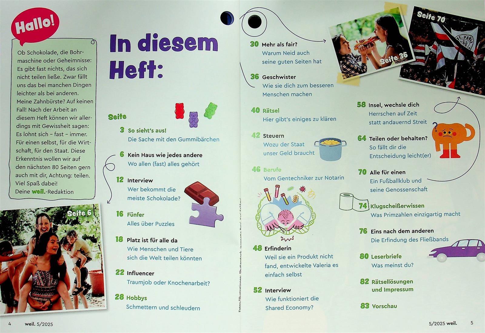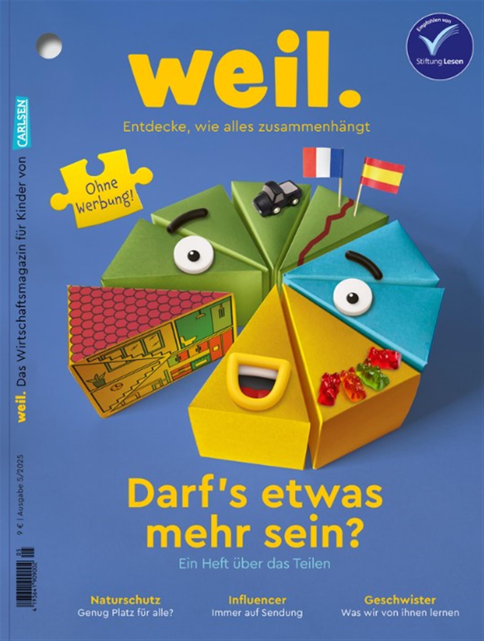 Die Geschichten in weil. spiegeln den Alltag der Kinder: Sie erzählen von Filmen und Spielekonsolen, von Haustieren und dem neuen Paar Sneaker, von Risiken und von Chancen. Kinder entdecken im Magazin, wie alles zusammenhängt: der Lohn der Näherin in Vietnam mit einem Kassenzettel in Deutschland, die Hilfe für die Nachbarn mit dem ersten selbstverdienten Geld. So lernen sie spielerisch, dass Wirtschaft bedeutet, sich in der Welt zurechtzufinden, mit anderen zu handeln und zu planen, das eigene Leben zu gestalten und sich Neues auszudenken. Auf den Lehrplänen der Schulen spielt Wirtschaft oft immer noch eine untergeordnete Rolle. weil. hilft Eltern und Schulen, diese Lücke zu schließen.