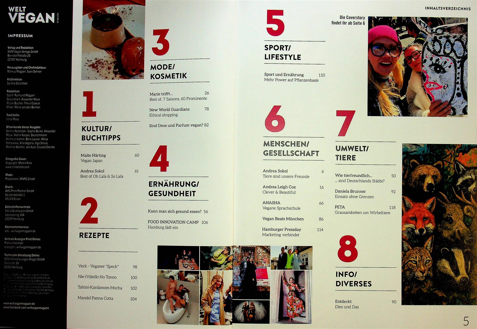 Mit dem Welt Vegan Magazin hält der Leser eine Zeitschrift in Händen, welche einen breiten inhaltlichen Ansatz bietet. Natürlich, veganes Essen darf auch in dieser Zeitschrift nicht fehlen, bildet es doch oftmals den Einstieg ins vegane Leben. Kulinarische Leckereien – köstliche Rezepte zum Nachkochen, sind ebenso wie Interviews mit Spitzenköchen und Verbraucherinformationen zu veganen Lebensmittelprodukten fester Bestandteil in den Ausgaben. Gleichfalls steht das Magazin aber auch für Berichte über Menschen der veganen Bewegung – in spannenden Interviews verraten sie ihr Verhältnis zum Thema Vegan. Reportagen und Hintergrundartikel über nachhaltig produzierende Modelabels, zu Materialien und Produktionsverfahren, einzigartige Reiseberichte rund um den Globus, Gesundheit, Kosmetik, Umwelt und Tierschutz, Sport, Wellness, Kultur und Gesellschaft – das Welt Vegan Magazin fördert Substanzielles zu vielen veganen Themen zutage.
