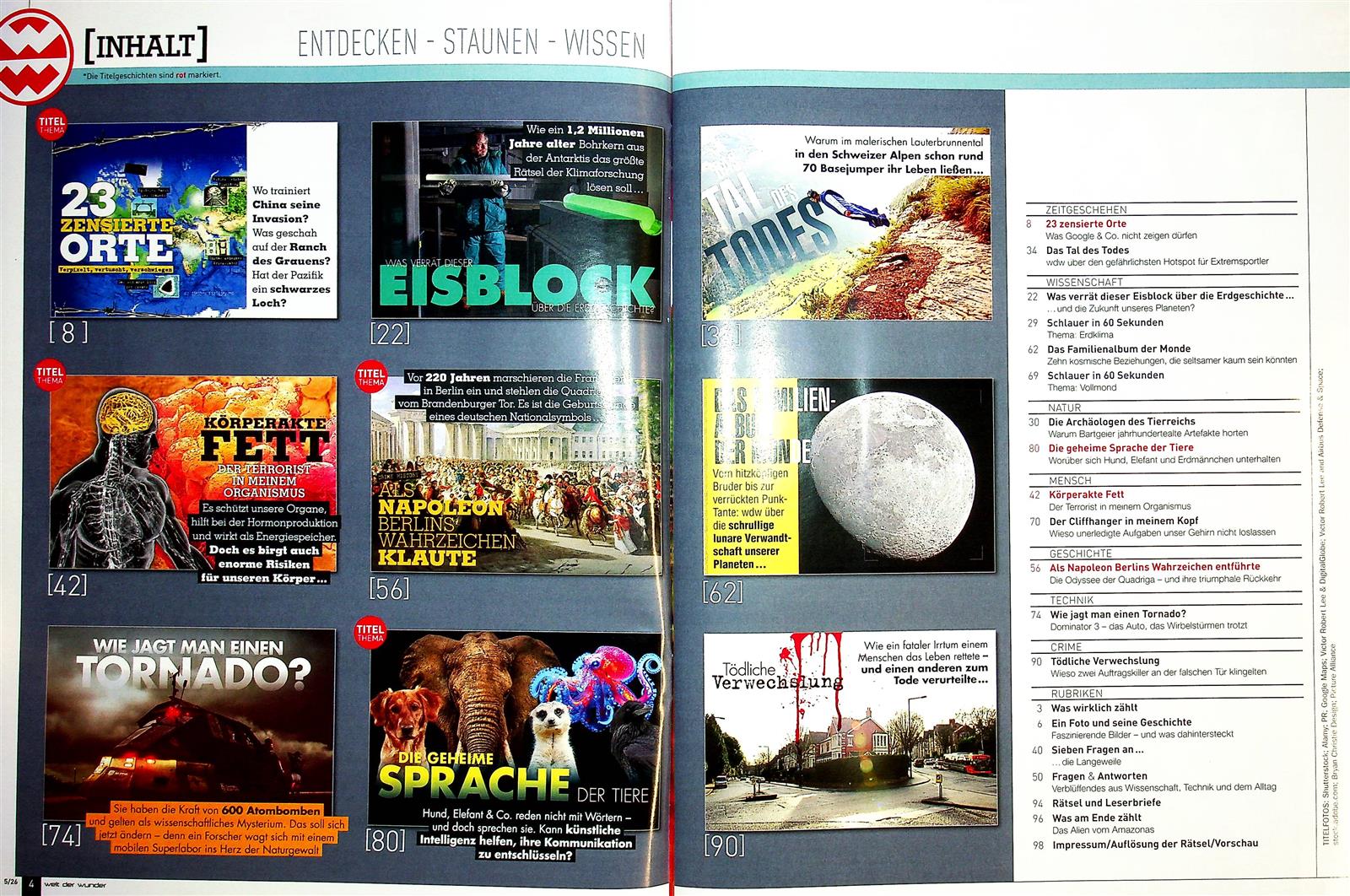 Welt der Wunder ist eine populäre deutsche Zeitschrift, die sich auf Themen aus Wissenschaft, Technik, Geschichte und Natur spezialisiert hat. Die Publikation bietet ihren Lesern spannende Artikel, die komplexe Zusammenhänge verständlich erklären und interessante Fakten präsentieren. Mit einer Mischung aus informativen Berichten und ansprechenden Bildern regt Welt der Wunder die Neugier der Leser an und fördert das Verständnis für verschiedene Themenbereiche. Die Zeitschrift ist sowohl für Fachleute als auch für Laien geeignet und hat sich als eine wichtige Informationsquelle in Deutschland etabliert.