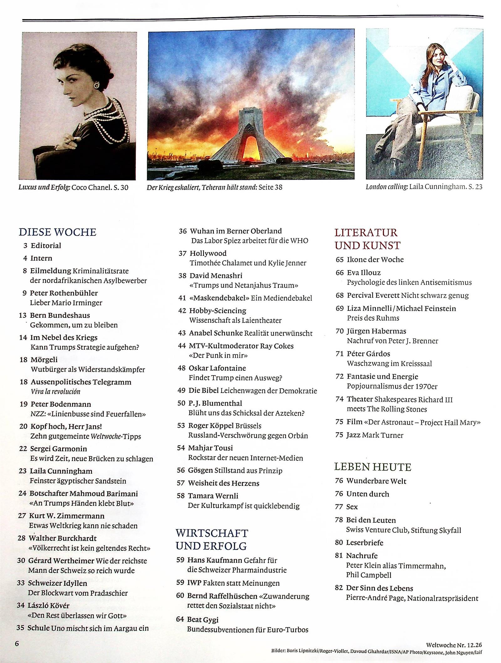 Die Weltwoche bietet Ihnen kritischen Recherchejournalismus. Kritisch, skeptisch, manchmal bewusst aggressiv, bereitet sie Themen aus allen Bereichen der Politik, der Kultur, aus Wirtschaftspolitik und Gesellschaft auf. Ein Gegenpol zum Mainstream, deckt sie Missstände auf, und bleibt hartnäckig an Fragen dran, die relevant sind für die Entwicklung der Gesellschaft der Schweiz, Europas und der Welt.