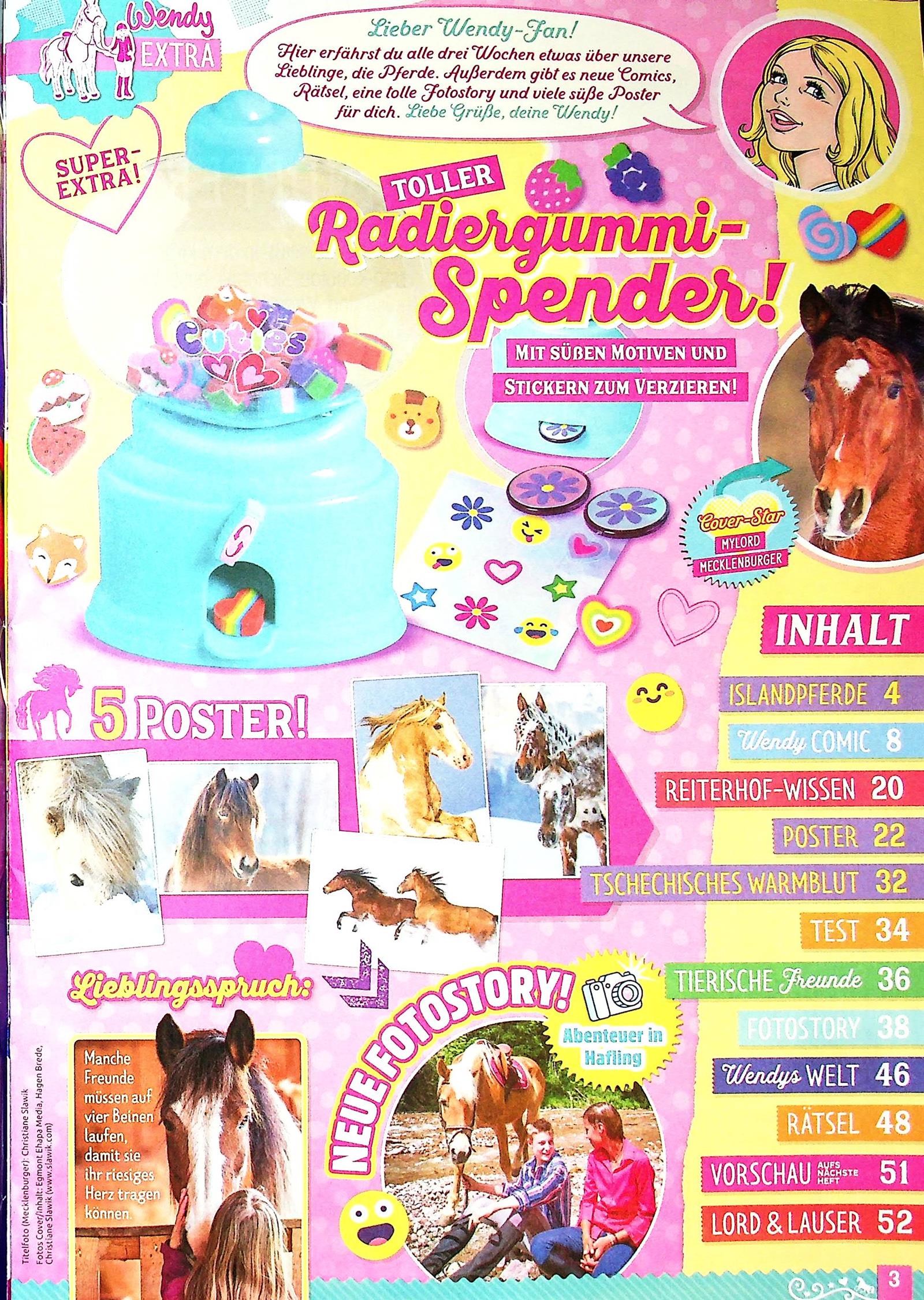 Dich erwarten spannende Infos über Islandpferde, ein Comic, Rätsel und Reiterhof-Wissen. Es gibt eine neue Fotostory mit einem Haflinger-Abenteuer und viele süße Poster. Als Extra bekommst du einen tollen Radiergummi-Spender mit Stickern zum Verzieren. Pferdefans kommen voll auf ihre Kosten!