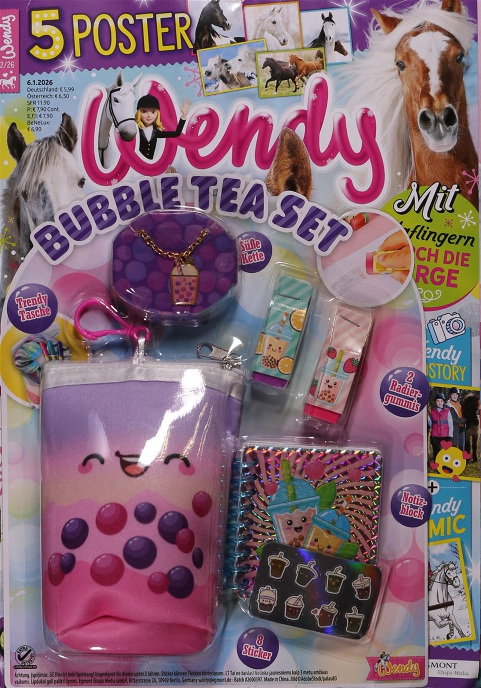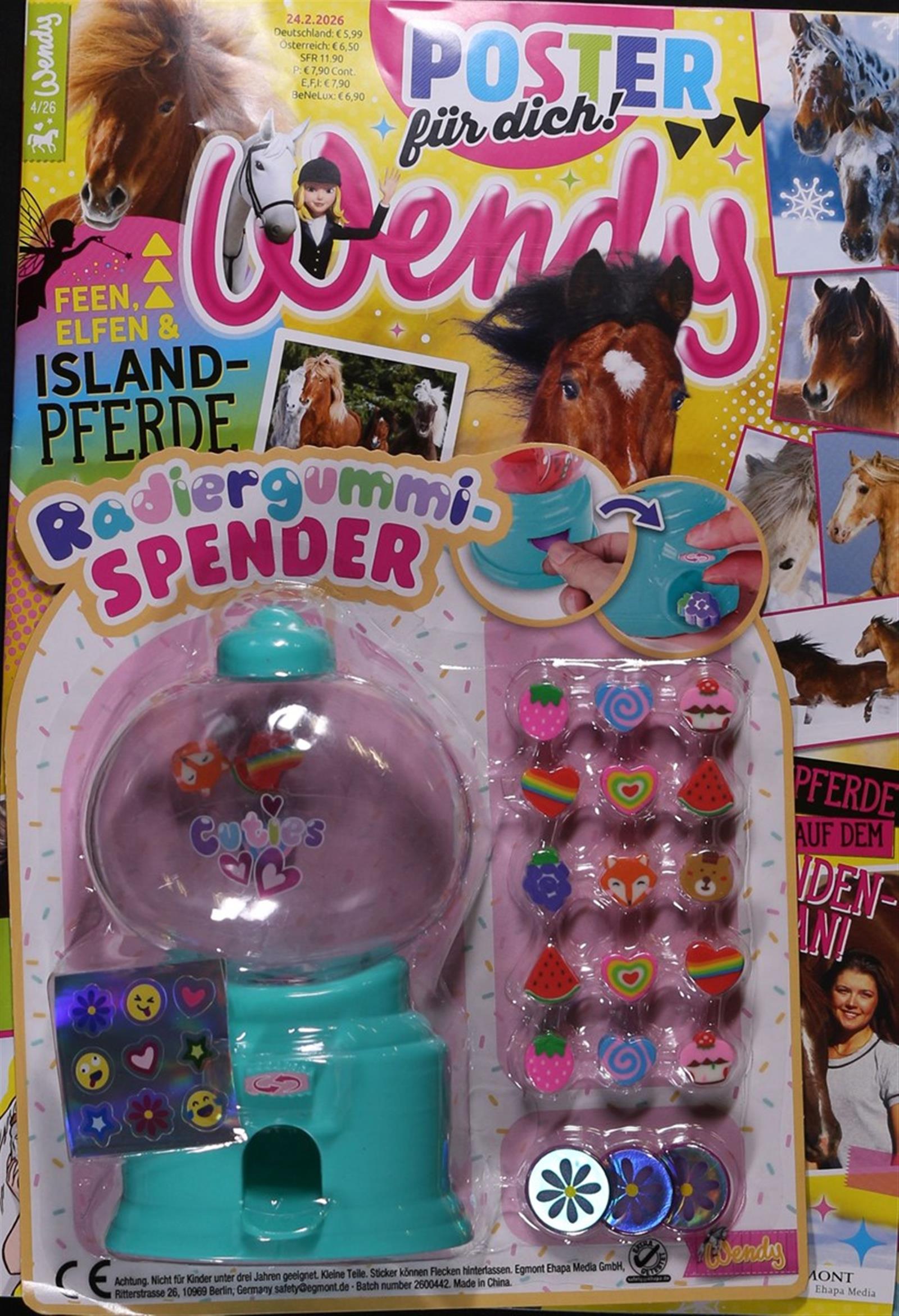 Das Heft wirbt mit 1 von 17 kleinen Geschenken wie Schmuck, Schreibwaren oder Pferde-Accessoires. Die Extras dienen als spielerischer Einstieg in die Wendy-Welt.