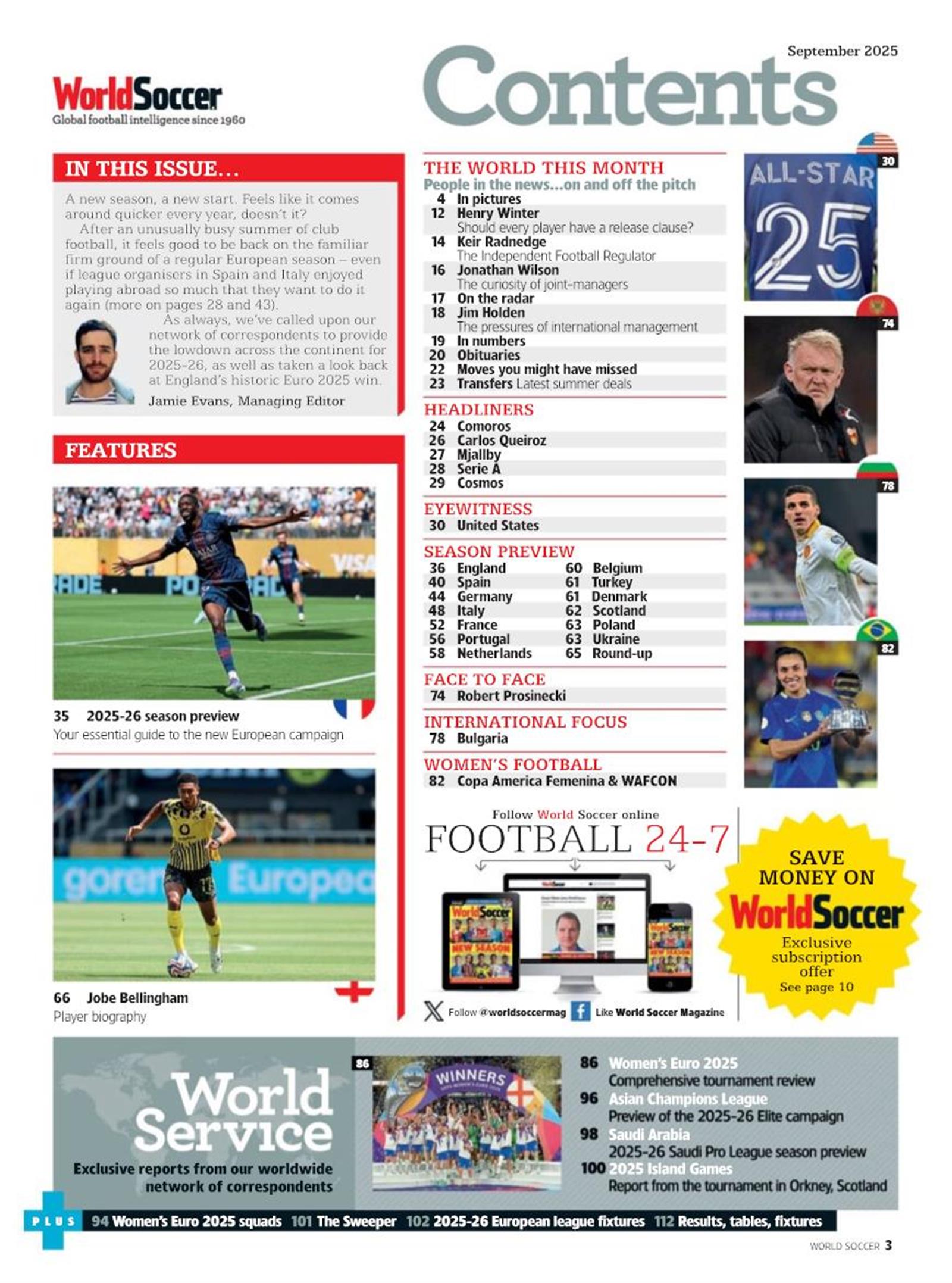 Die World Soccer Zeitschrift bietet eine Vielzahl von Inhalten rund um den Fußball. Zu den Schwerpunkten gehören Berichte über aktuelle Spiele und Turniere, Interviews mit Spielern und Trainern, Analysen von Taktiken und Spielstrategien, sowie Hintergrundgeschichten aus der Fußballwelt. Die Zeitschrift deckt sowohl nationale als auch internationale Ligen und Wettbewerbe ab, und informiert die Leser über die neuesten Entwicklungen im Fußballgeschehen. Darüber hinaus enthält sie Statistiken, Rankings und Prognosen für kommende Spiele. Insgesamt bietet die World Soccer Zeitschrift eine umfassende Berichterstattung über das große Thema Fußball.