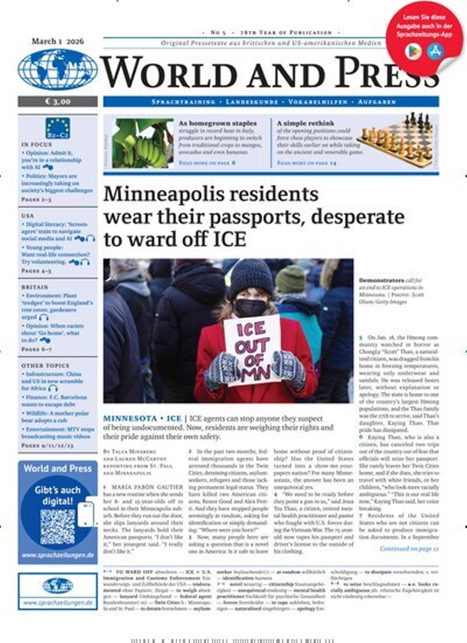 Unter den Sprachzeitschriften nimmt die World and Press eine Sonderstellung ein. Bereits seit 1949 erscheint das Magazin und sammelt Originalartikel aus britischen und US–amerikanischen Zeitschriften und Zeitungen. Die Zeitschrift erscheint vierzehntäglich. Das Premium-Abo beinhaltet die Zeitschrift, die Onlinehilfe und die mp3 im Komplettpaket. Bitte geben Sie bei der Bestellung die Mailadresse an, an die die Materialien geschickt werden sollen.