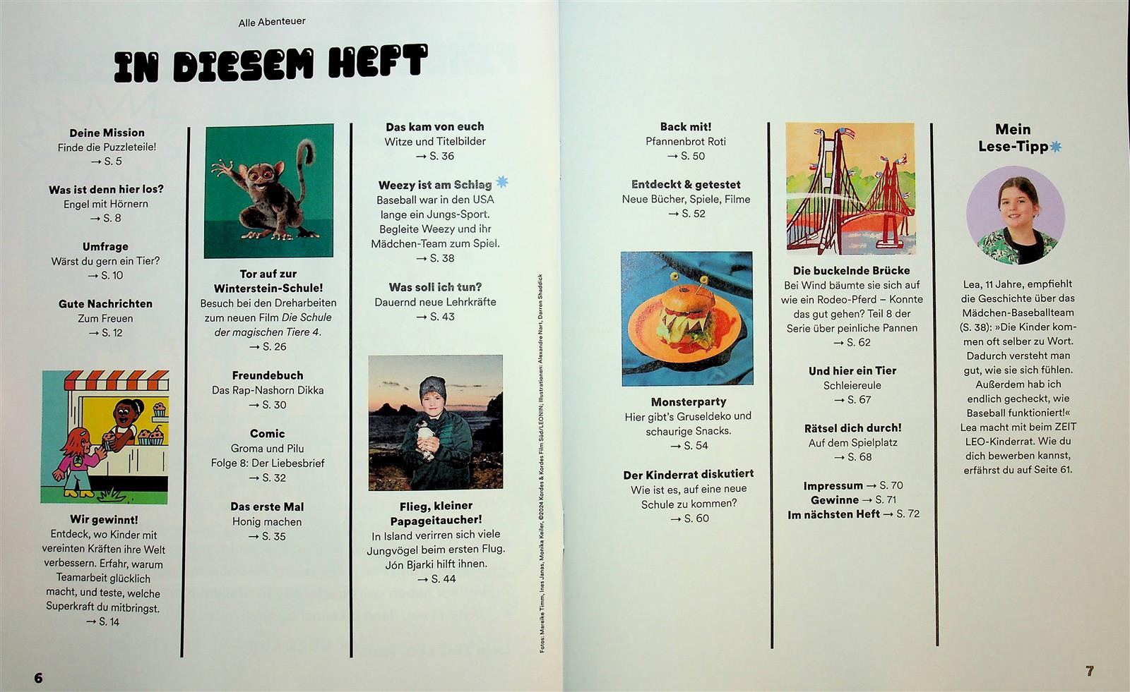 Die ZEIT LEO ist ein Ableger der berühmten Wochenzeitung DIE ZEIT. Das Kindermagazin spricht Kinder ab acht Jahren bis ins jugendliche Alter an. Das Magazin gliedert sich nicht in klassische Bereiche, sondern berichtet über aktuelle Themen aus der ganzen Welt.