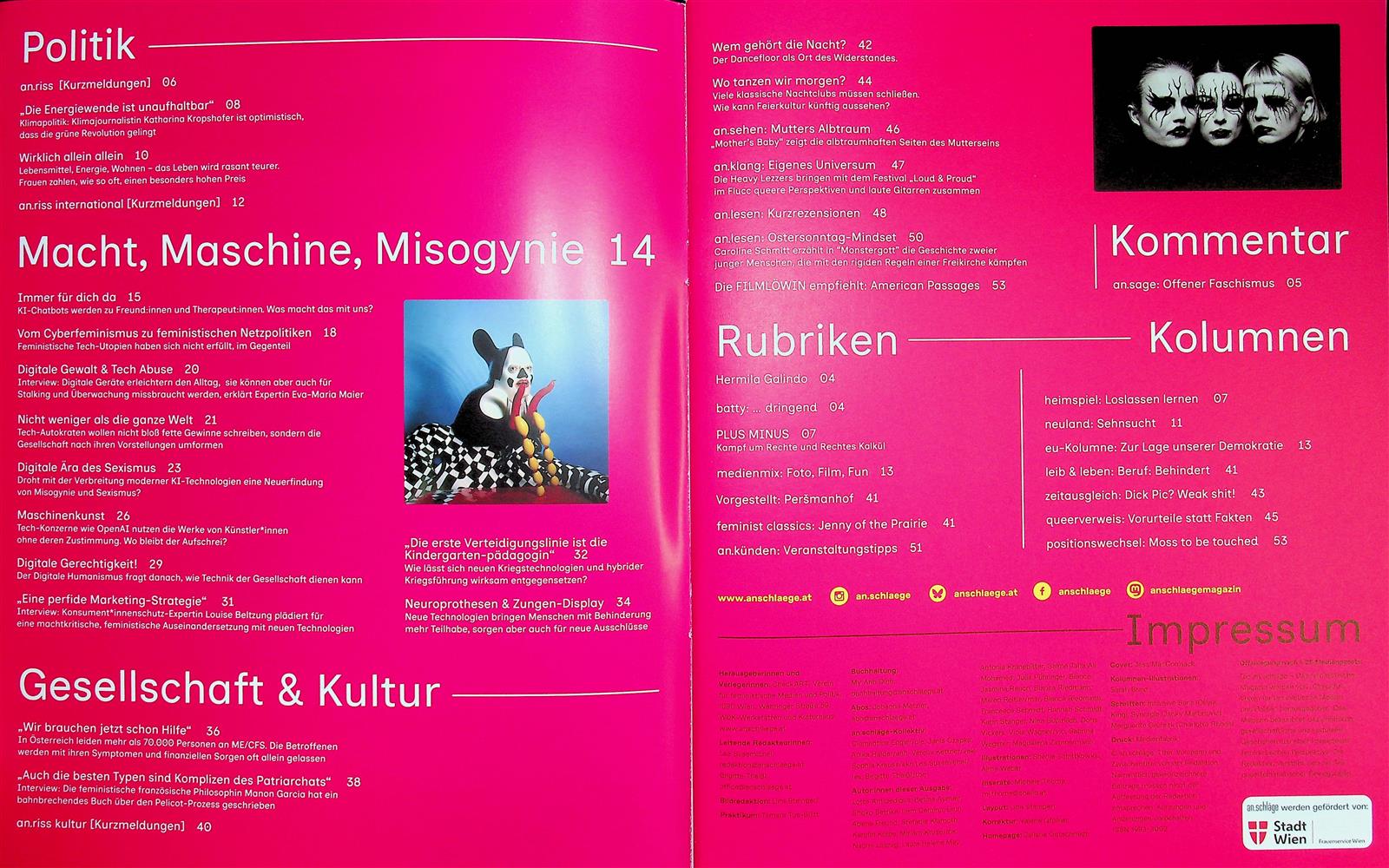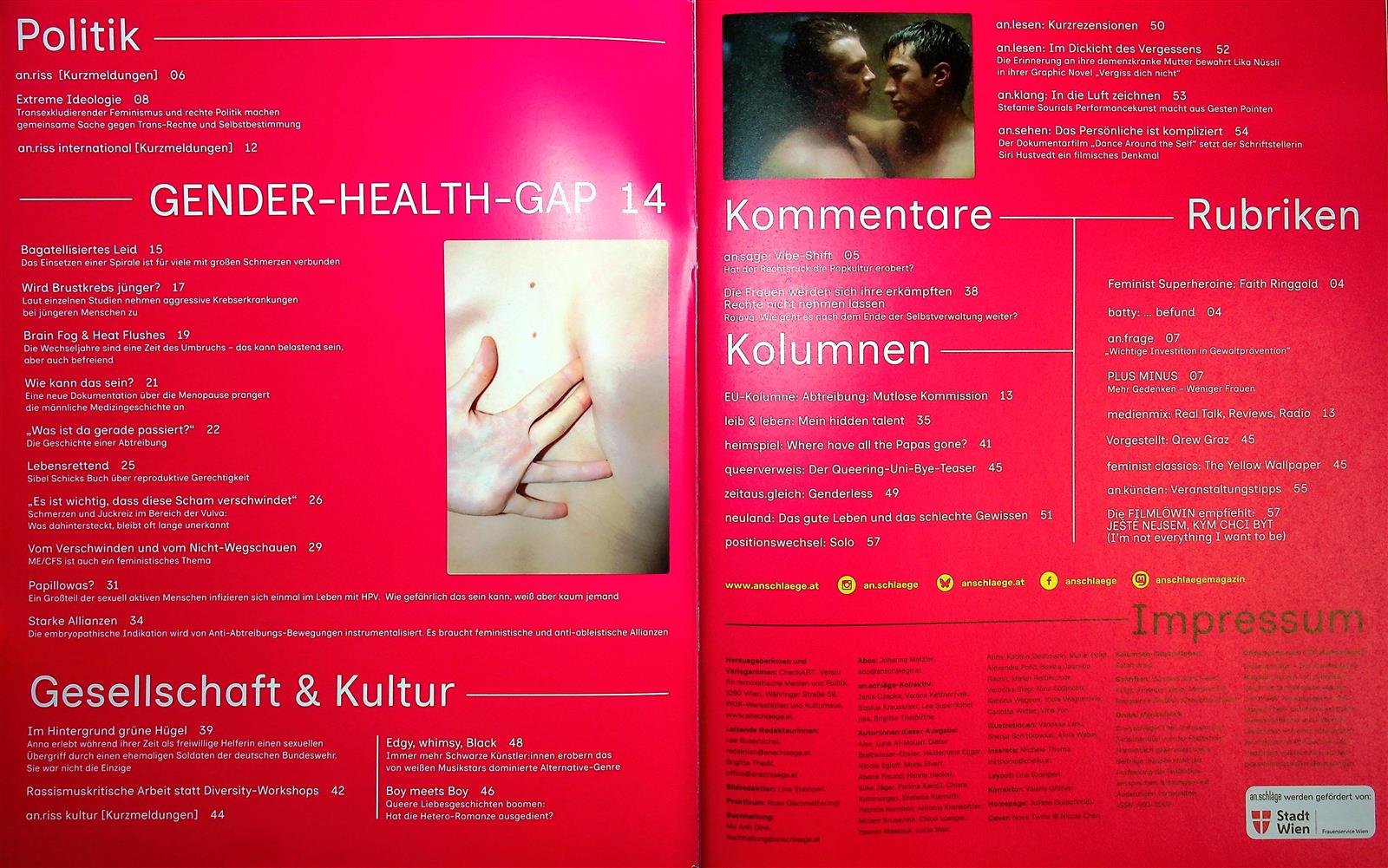 Ausgewogen zählen Artikel und Analysen, Kulturberichte und Reportagen ebenso wie Interviews und Kommentare oder Glossen und Bildkolumnen zu den durchweg präsentierten feministischen Standpunkten in an.schläge.