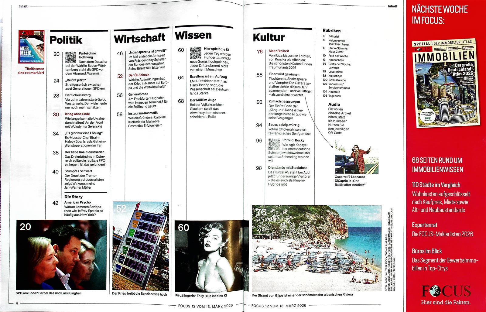 Mit einem Focus Abo erwartet die Leser das gesamte Spektrum gesellschaftsrelevanter Themen. Gegliedert in sieben Rubriken liefert die Zeitschrift nicht nur Nachrichten, sondern nützliche Fakten und Einordnungen. Unterstützt werden die Berichte mit Bildern und aufschlussreichen Infografiken. Politische Diskurse und wirtschaftliche Entwicklungen bilden die Basis in seiner Themenwelt. Geschehnisse werden eingeordnet, die Geschichten und Persönlichkeiten dahinter beleuchtet. Kompetente Analysen und Handlungsstrategien rund um das Anlage- und Finanzwesen warten auf den Leser in der Rubrik Finanzen.