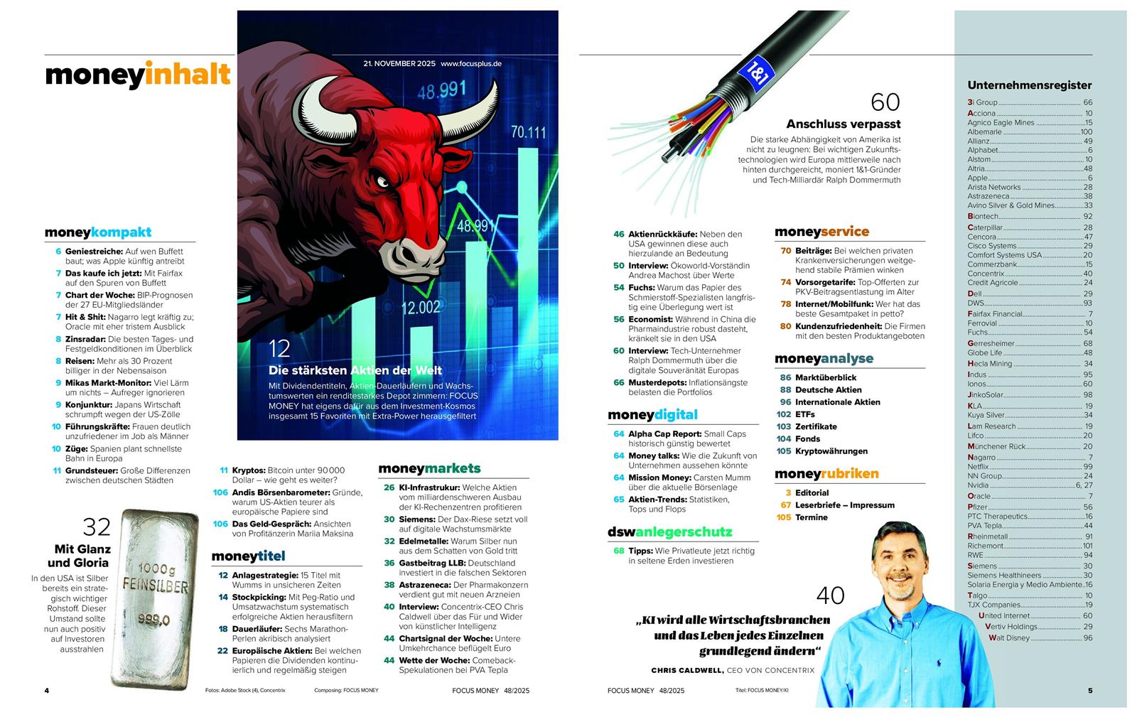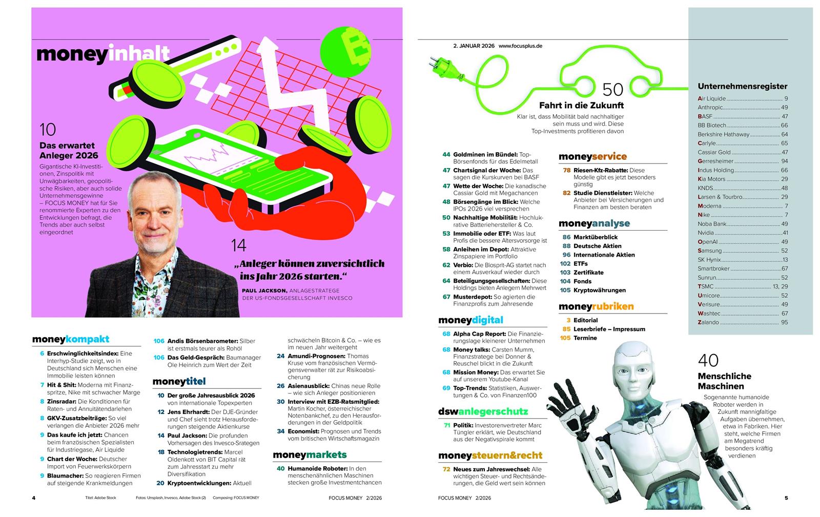 Das Magazin deckt ein breites Spektrum an Themen ab, von detaillierten Analysen zu Aktien, Fonds und Anleihen bis hin zu politischen Entwicklungen, die die Finanzmärkte beeinflussen. Leser finden fundierte Berichte und Kommentare zu Rohstoffen, Immobilien und Steuerstrategien. Regelmäßige Interviews mit Top-Entscheidern aus Industrie und Finanzwelt bieten tiefere Einblicke und machen das Focus Money Magazin zu einem umfassenden Begleiter für Anlageentscheidungen und wirtschaftliche Orientierung.