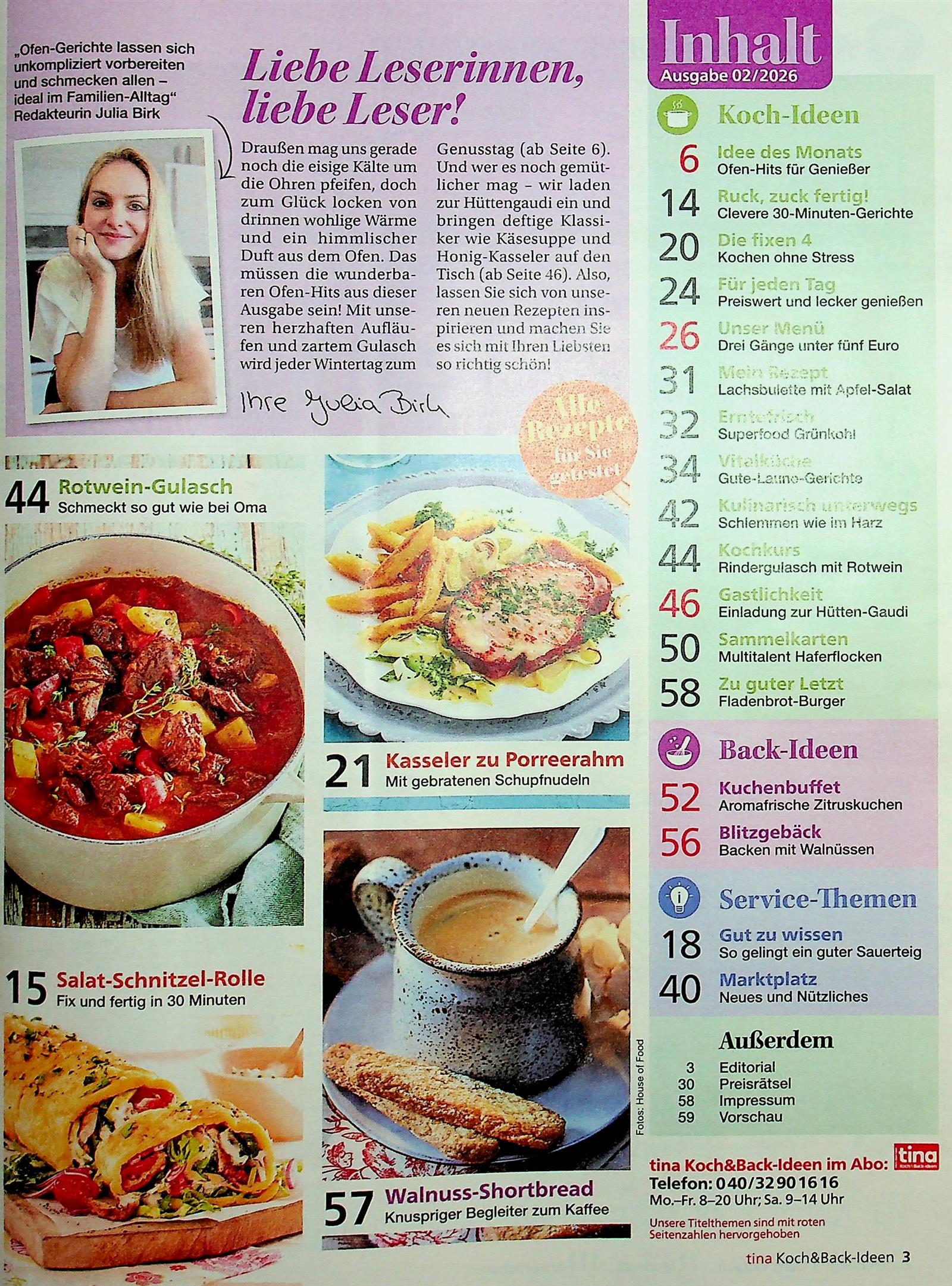Tina Koch- und Backideen ist eine klassische Kochzeitschrift, die vielfältige Rezepte zu jedem Anlass zum Inhalt hat. Sie steht für Anregungen bei der täglichen Frage, was auf den Essenstisch kommt ebenso für das Besondere bei festlichen Anlässen.